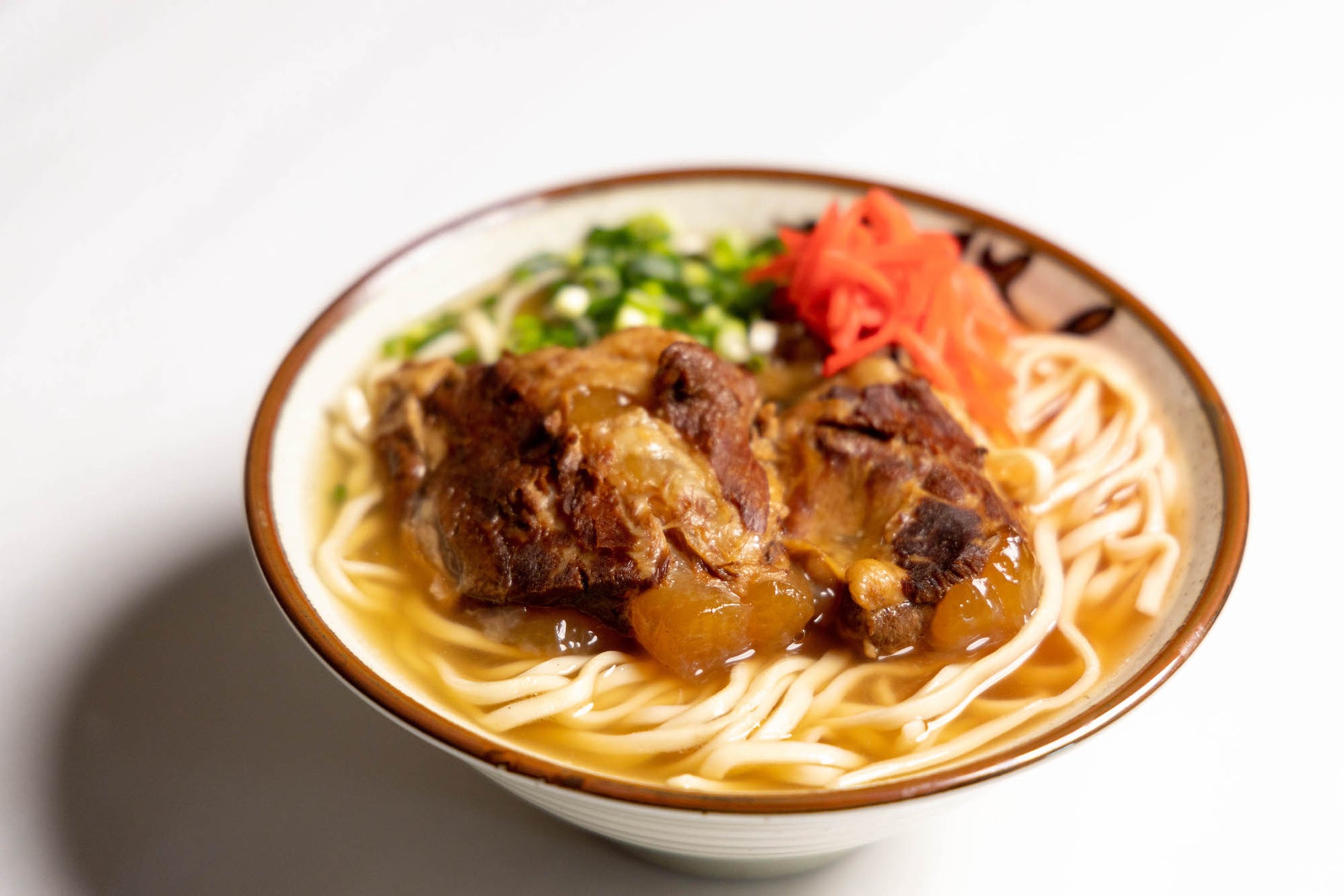 どっしりとした軟骨ソーキが乗った、食べ応え抜群の一杯。じっくりと時間をかけて調理したソーキ肉は、軟骨も食べられるほどのトロトロ食感です。