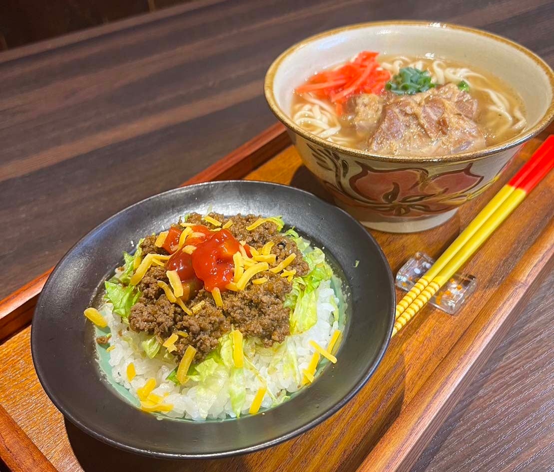 数十種類のスパイスが効いたタコミートと、ピリ辛のサルサソースが相性抜群。沖縄そばだけではちょっと物足りない方にぴったりのセットメニューです。