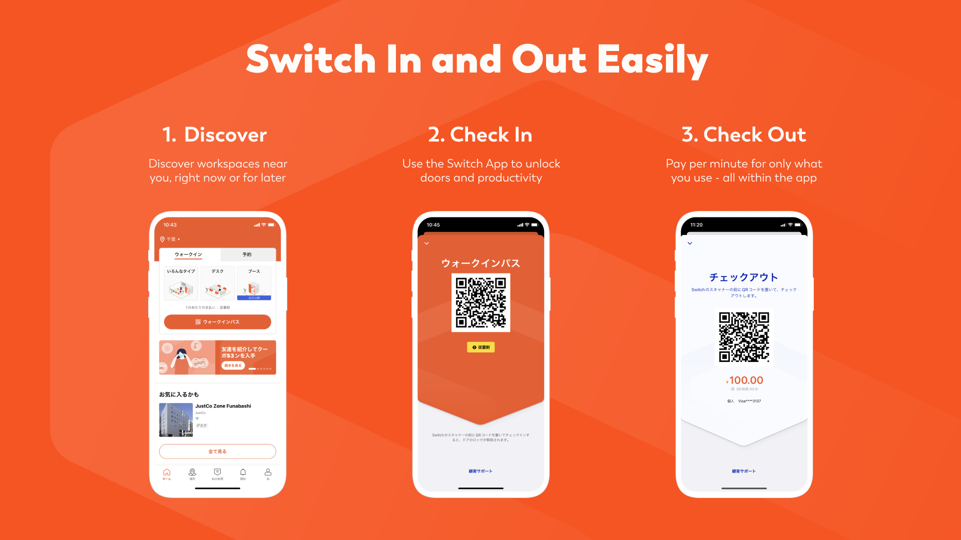 | 新規ユーザーには、「JustCo Zone」3店舗にて5時間無料で利用ができる300円券×10枚をプレゼント | Switchアプリをダウンロードすることで、簡単に交換ができます。 <https://bit.ly/3vOHqkP> または二次元コードを読み取ってください。 プロモコード「OPENZONE」を入力すると無料クーポンが発行されます。 ◇ご利用条件 ・2022年3月15日から5月31日までご利用可能です。 ・クーポンの有効期限は、ご利用後30日です。 ・新規登録者先着5,000名様のみ有効です。 ・1枚のクーポンで1回のみ利用可能です。1回の利用料金の合計がバウチャーに満たない場合、残額は返金されません。 |