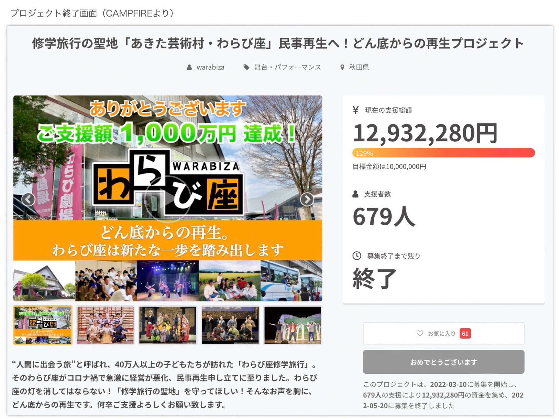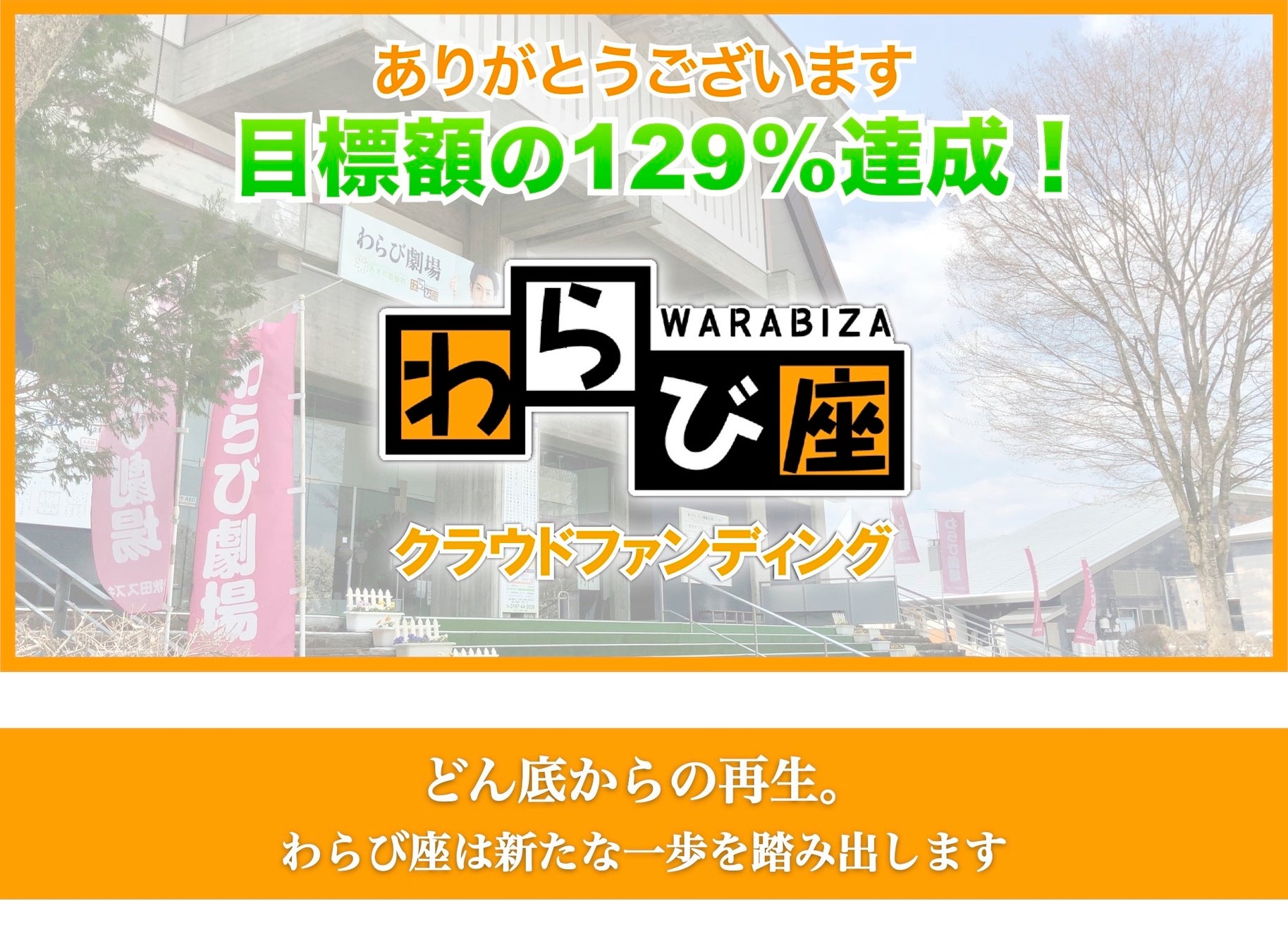 一般社団法人わらび座(本社:秋田県仙北市、代表理事:今村晋介)は、3月10日に開始したクラウドファンディング「どん底からの再生プロジェクト」が成功し、目標額を上回る1293万円のご支援をいただいて5月20日に終了したことをご報告いたします。
