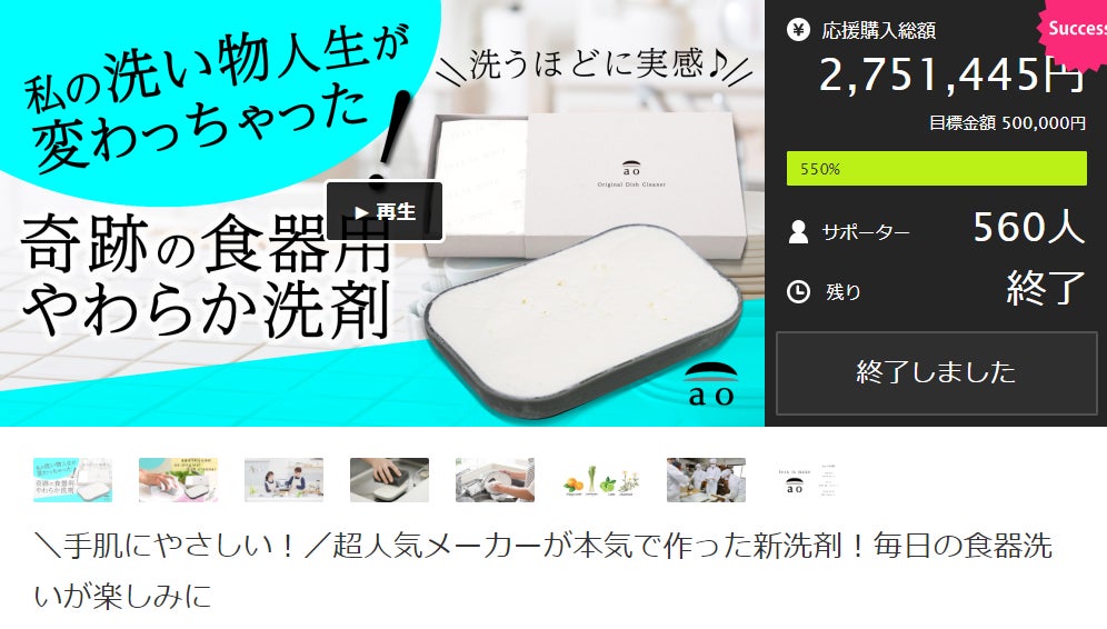 株式会社ダイニチ・コーポレーション(東京都世田谷区 代表取締役 吉田元之)は 2021 年 4 ⽉より準備を始めておりました新 D2C 事業であるキッチン用品ブランド「ao」(アオ)のプレ販売のクラウドファンディングサイト(Makuake)にて4月28日付け達成率550%、サポーター数560人で終了し、5月20日(金)からD2Cブランドを自社サイトで開始致します。