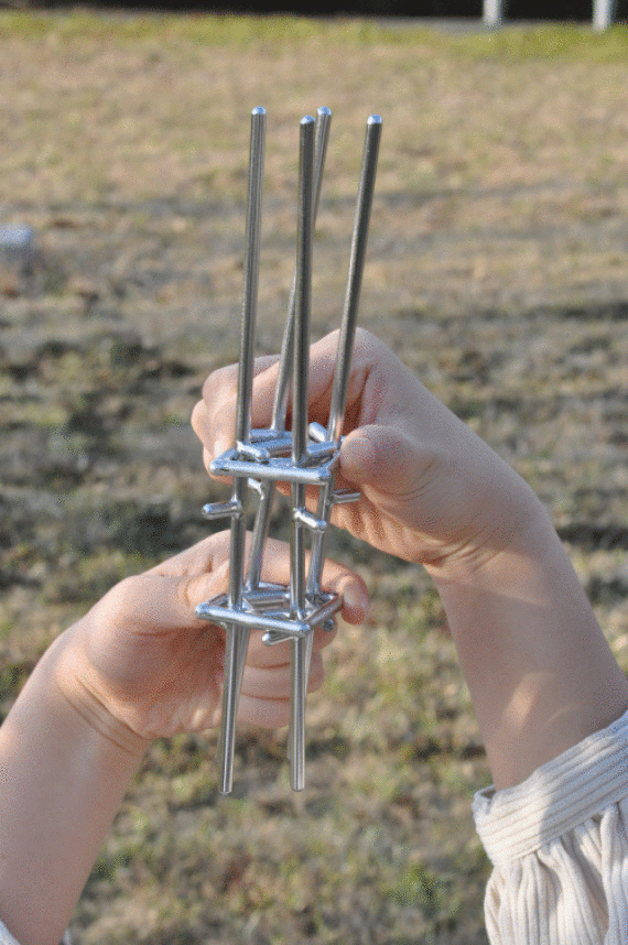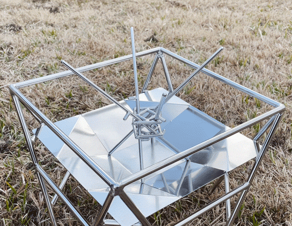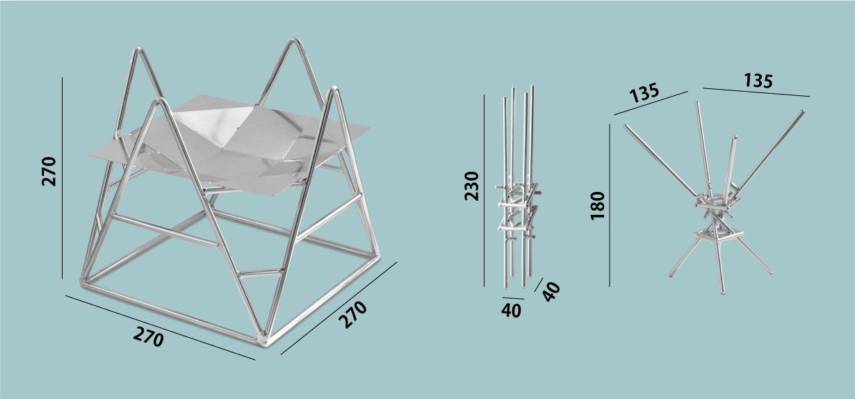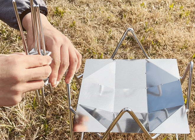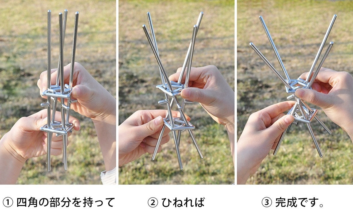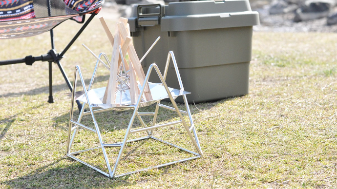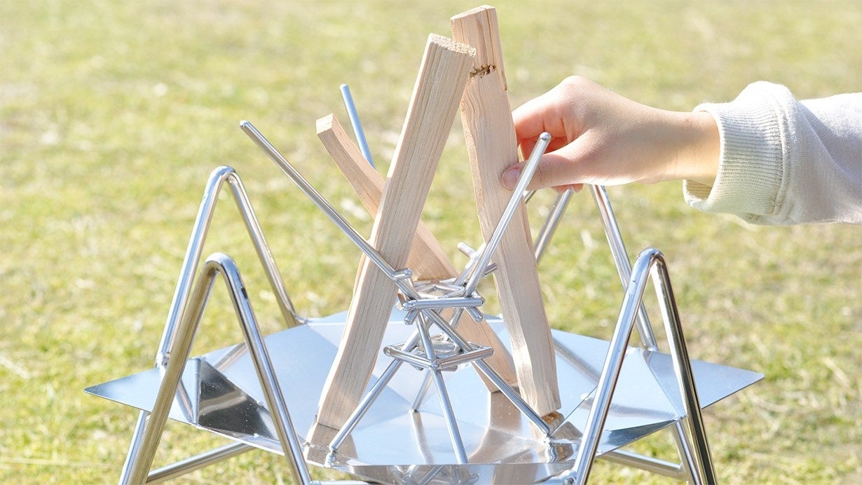 焚き火をしたいけど、うまく火を点けられるか不安。そんな焚き火初心者の悩みを解決できるのがmakitateです。ステンレスの棒を組み合わせただけの単純な構造ですが、使い方はひねって自立させ、そこに薪を立てかけるだけ。薪でつくった三角錐に中に新聞紙などの燃えやすい素材を入れて着火すれば、自然に炎が薪に燃え移り、誰でも簡単に美しい焚き火を楽しむことができます。