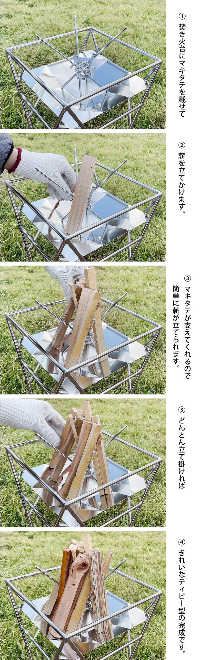 2.「makitate」を使えば、簡単に薪を組むことができ、美しい炎をつくることができる