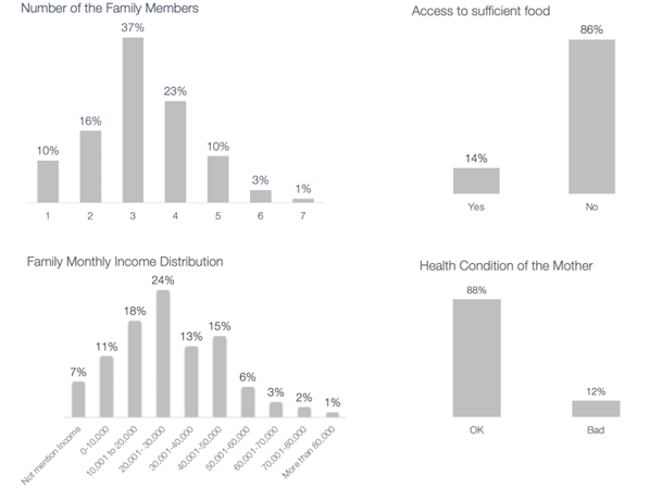バウチャーを受け取った女性のうち105名にサーベイを実施しました。今回の支援では収入の上限を設けませんでしたが、平均月収が2~3万ルピー(約7,500円~11,000円)と低所得者層が多いことがわかりました。また、健康不安を抱えていると答えた女性は12%と少ない一方で、食糧が不十分であると回答した女性は86%と、多くが食料の調達に困難な状況であることが分かりました。