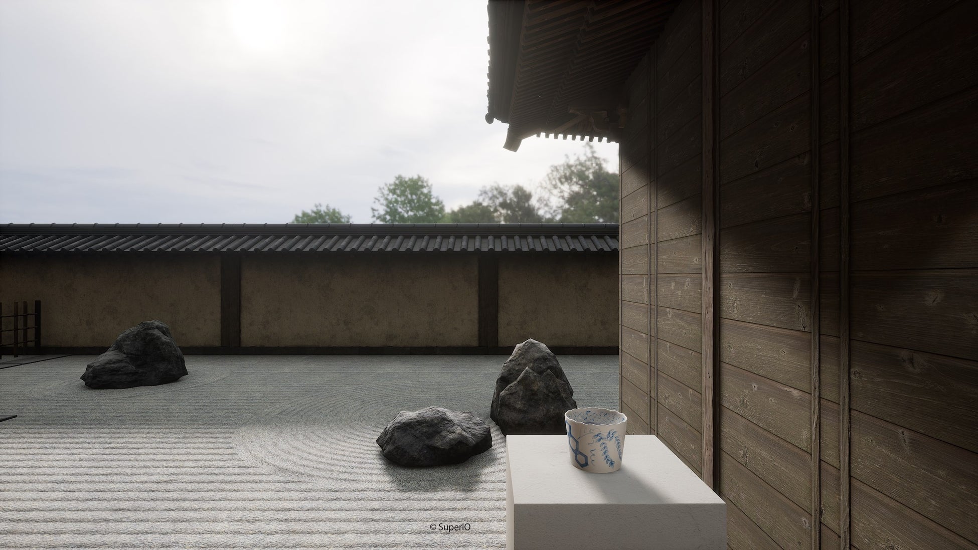 VRゴーグルを装着すると、和室を抜けて枯山水の庭に出ます。