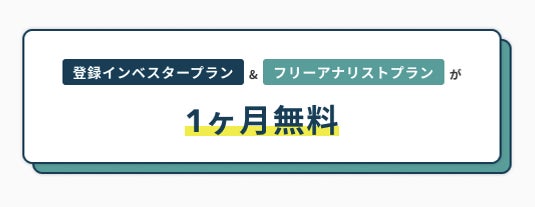 また同時に、登録インベスタープラン(税込495円/月)とフリーアナリストプラン(税込990円/月)を利用開始から1ヵ月無料化したことを合わせてお知らせします(既に有料登録されている方は1ヵ月分の支払いを免除致します)。