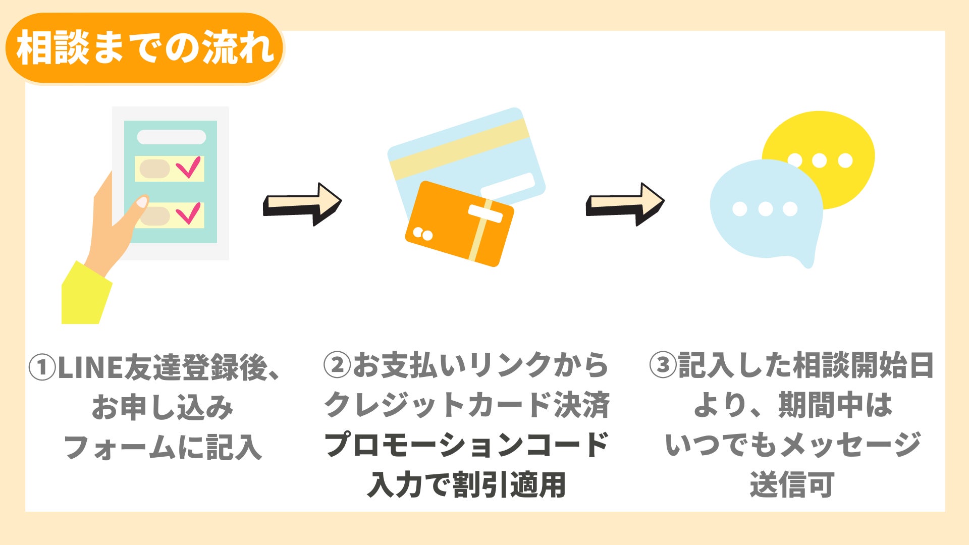 オンライン相談ルーム ハワユのLINE公式アカウントを友達登録し、お申し込みフォーム記入後、クレジットカード決済を頂き相談開始となります。