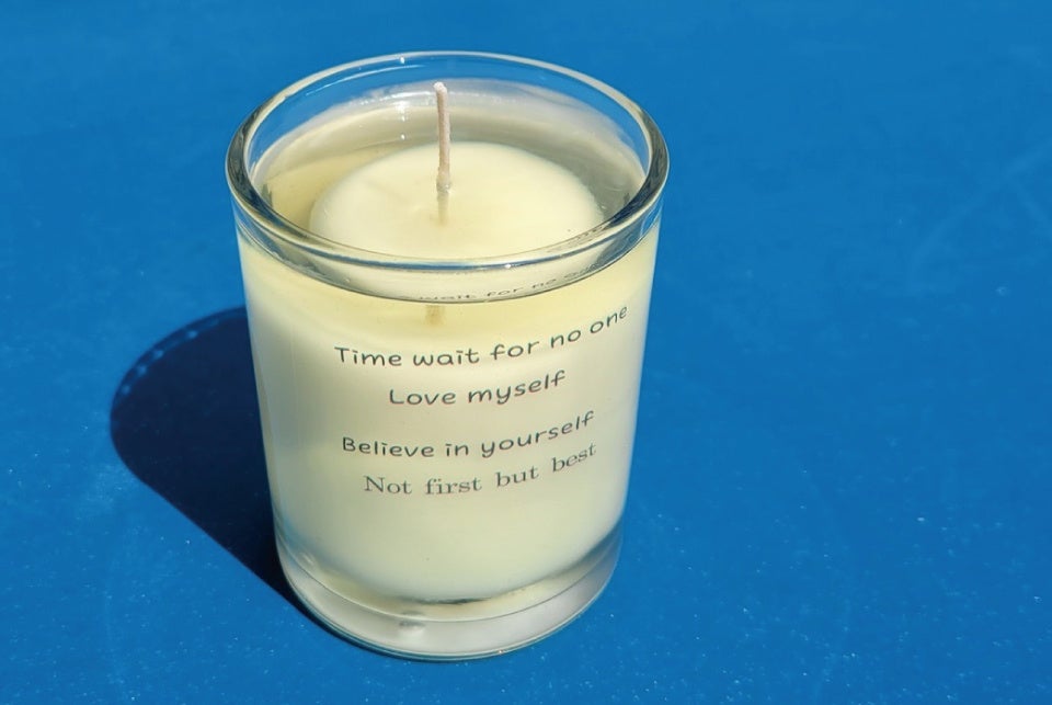 中からメッセージが浮き上がる不思議なキャンドルを試作中です。(注:カップにプリントされている訳ではありません。)