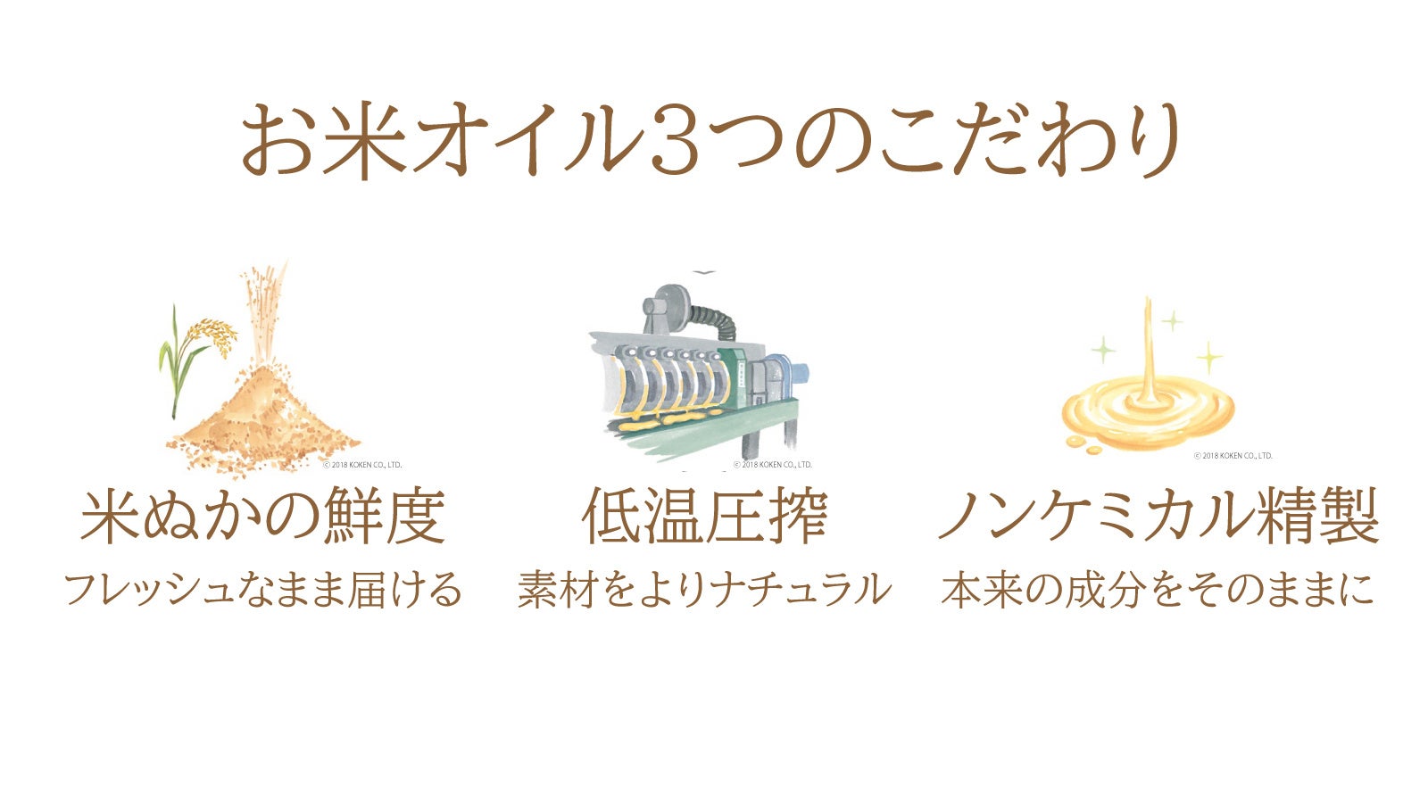 お米オイルは、本来の栄養をそのまま活かしたい思いから、搾油方法にこだわりました。栄養をしっかりと残すために、ノンケミカル精製法にこだわり、1週間かけて精製されたお米オイルは、生産量が少なく貴重です。