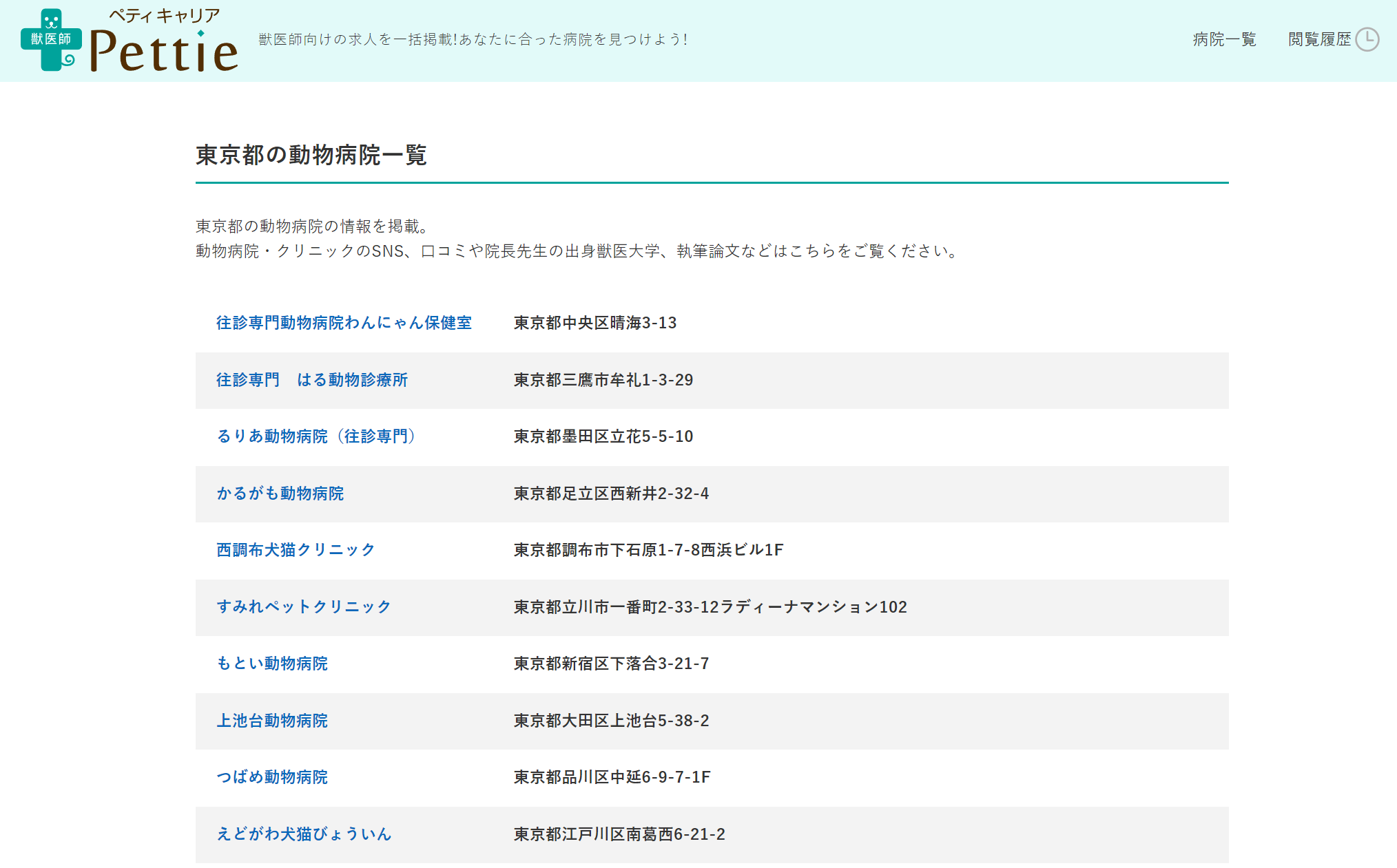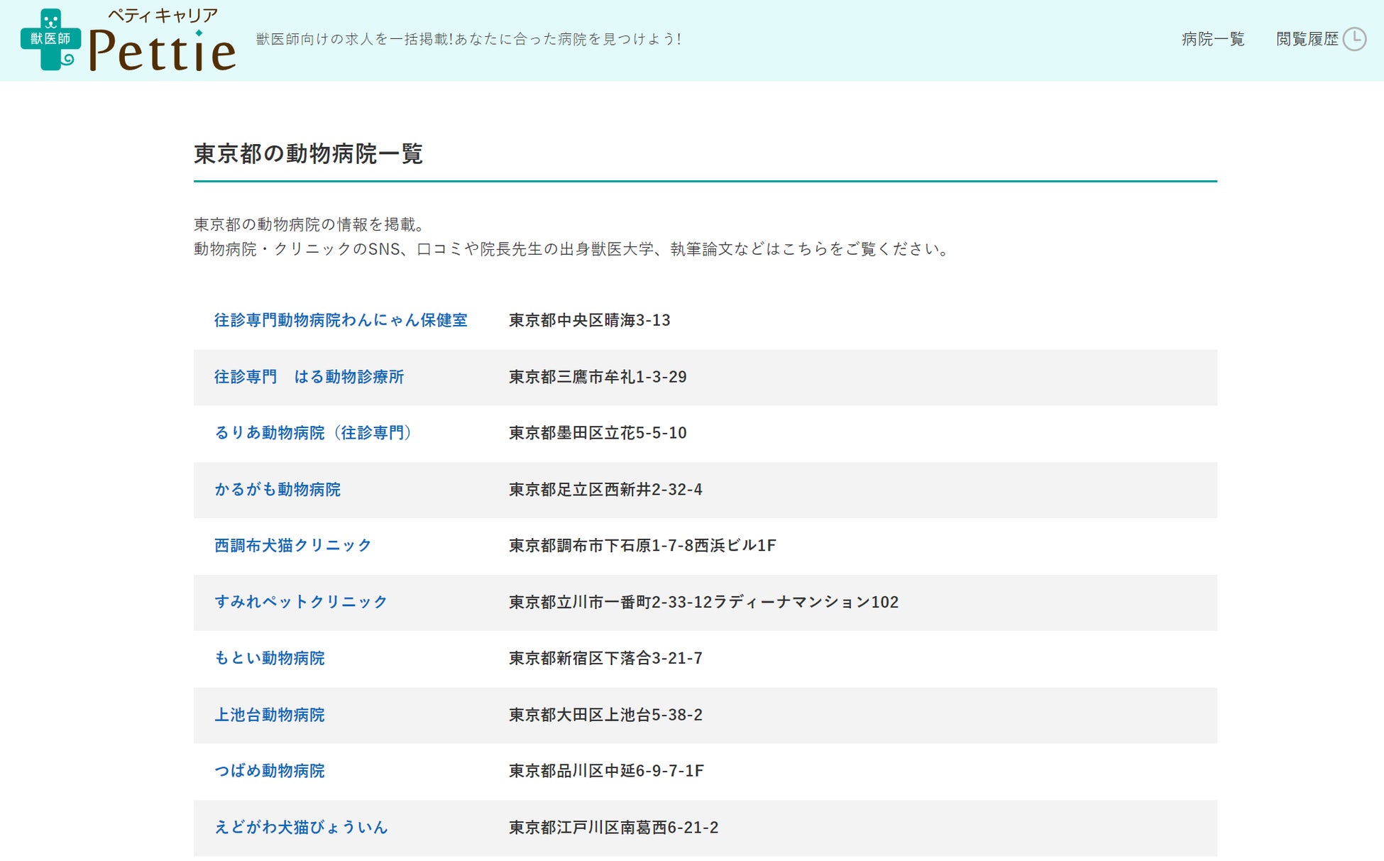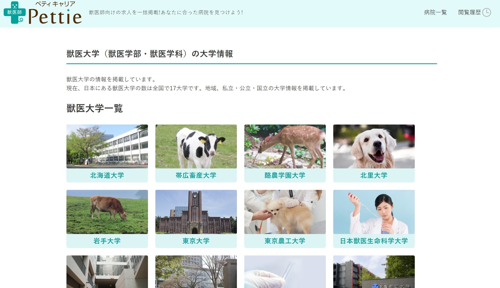 「Pettie獣医師キャリア」には動物病院や獣医大学の情報データベースを掲載