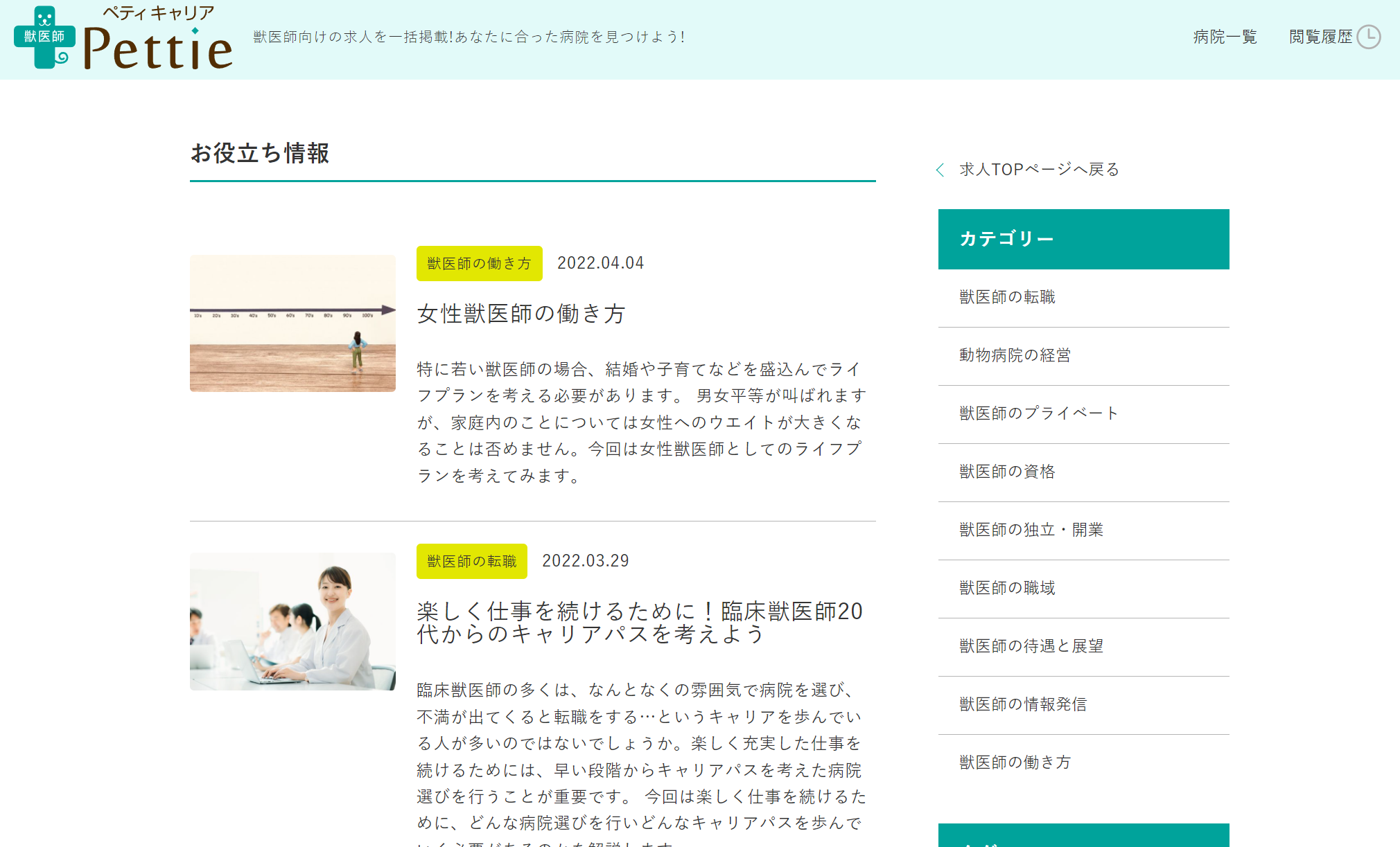 「Pettie獣医師キャリア」はお役立ちコンテンツが豊富