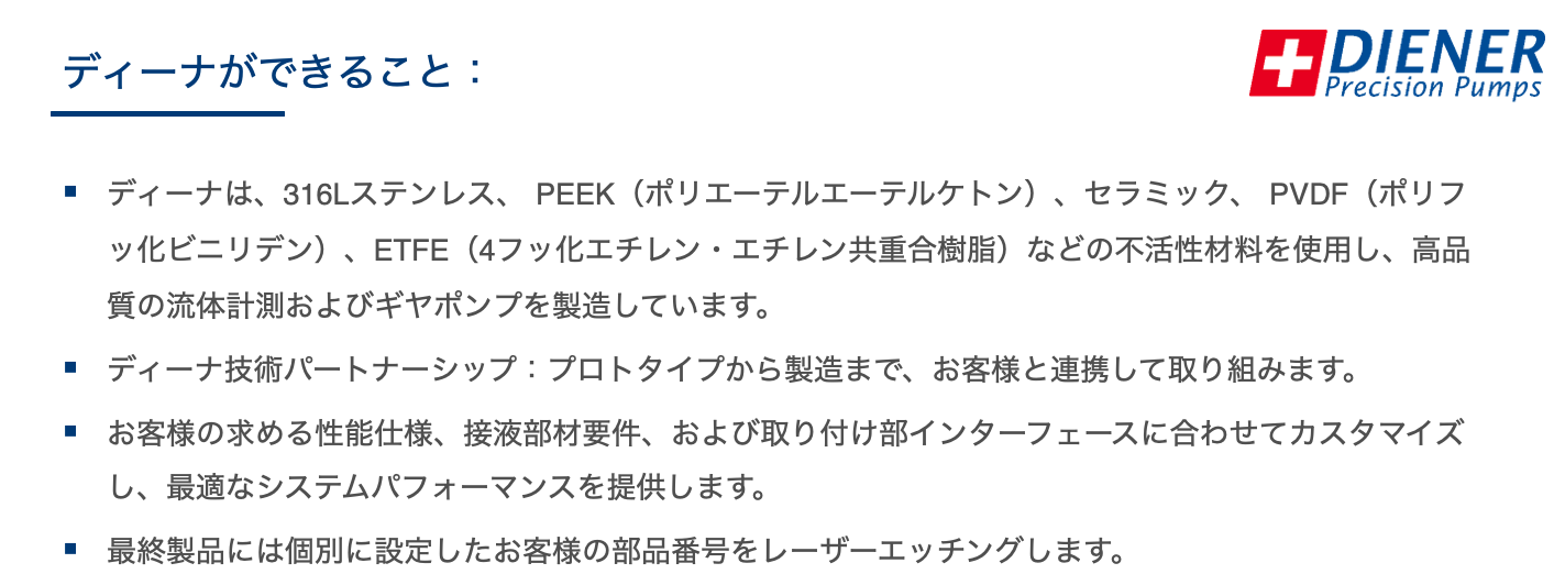 日本でのディーナプレシジョンポンプ社に関する製品の機能や詳細情報をお求めの方は、以下のURLからご覧ください。