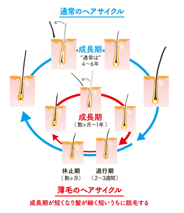 薄毛の場合は、この成長期が数ヶ月~1年。まだ髪が細く短いうちに抜けてしまいます。