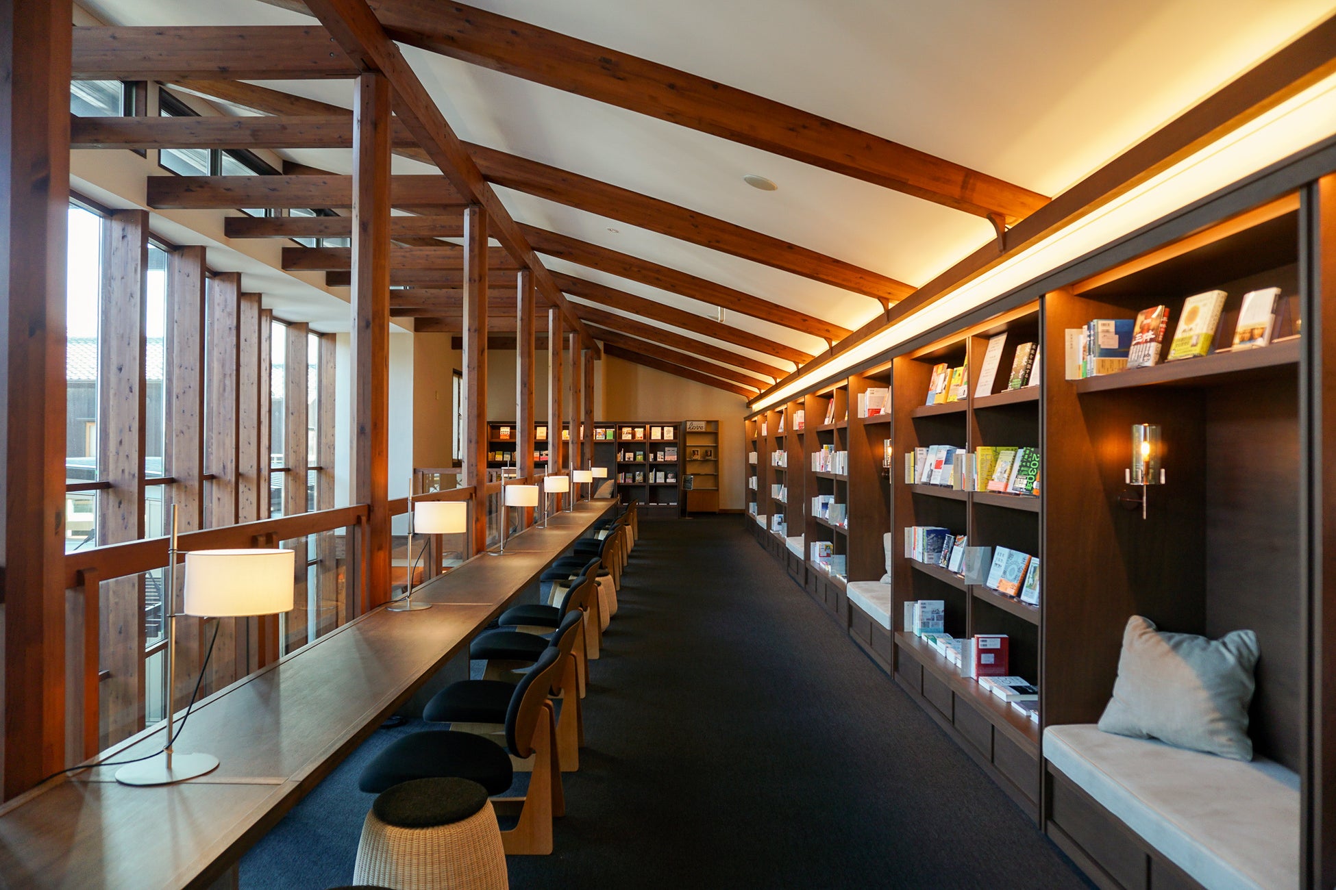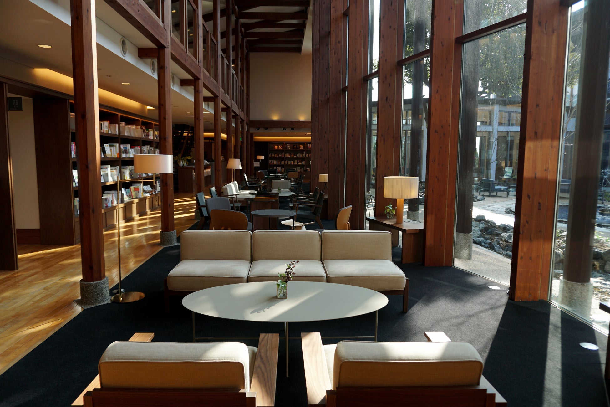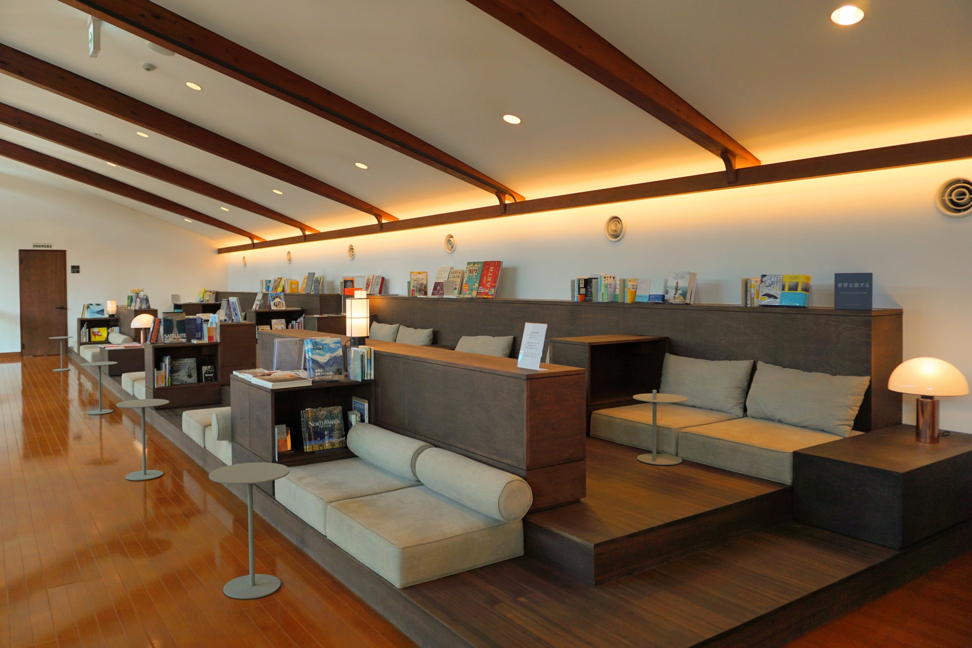 館内デザインはetc inc. 吉田愛さんが手掛け、SUPPOSE DESIGN OFFICE(株)が監修を担当。日常から離れて心地よい時間を過ごすための空間ができあがりました。裸足でくつろげるブックラウンジでは本棚の中の篭り席、中庭のデッキテラス、木漏れ日がさしこむ席や、雛壇状のソファー席など、この空間ならではの豊かな体験と、ゆったりとした時間をデザインしています。