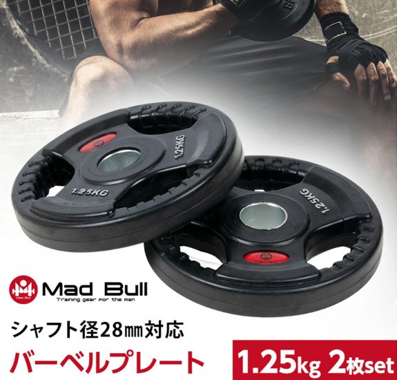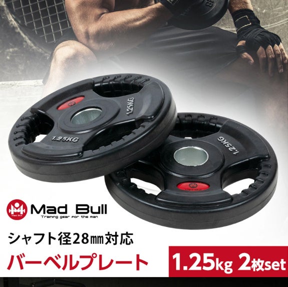バーベルプレート5種類 1.25kg /2.5kg/5kg/10kg/20kg。シャフト径28㎜対応。持ちやすいグリップホールをデザインし、両手で持つプレートトレーニングなど幅広いトレーニングを実現。フロアを傷つけにくいオールラバーコーティング仕様。錆付き防止、階下への騒音も和らげます。
