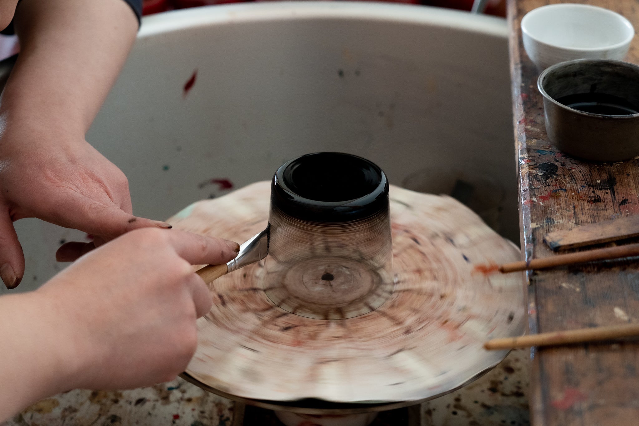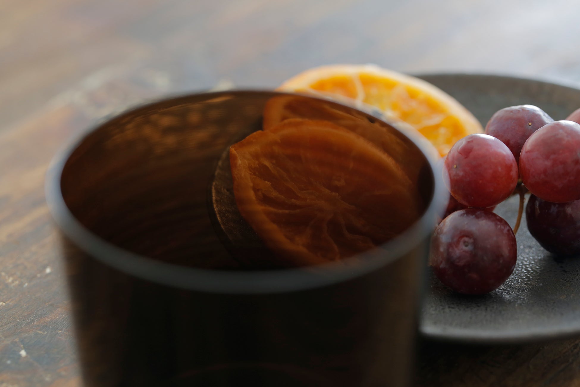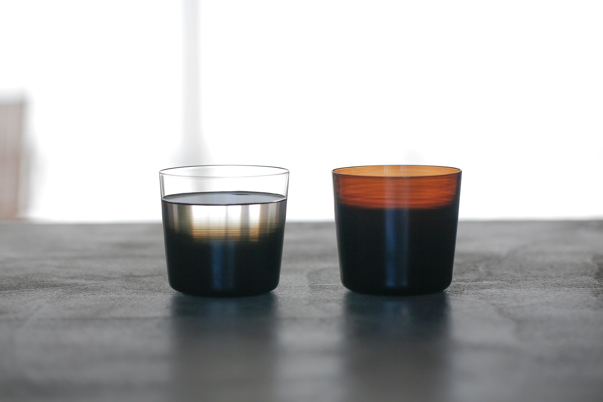 半塗りの上から鉄粉を混ぜることで黒く変化させた、透ける黒漆(黒呂色漆)を薄く塗り重ねています。一見真っ黒なグラスですが、光にかざすと不透明の黒から透けた黒へのグラデーションがのぞき、見る角度や光によって表情が変わります。