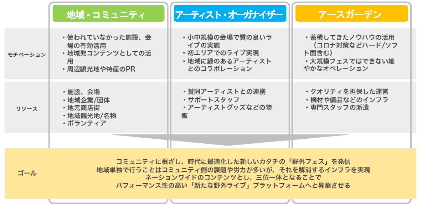 アースガーデンはこうした会場マッチングに限らず、野外ライブやフェスの共創を通して、地域・コミュニティ、アーティスト・オーガナイザーも含め、それぞれが“共稼自走”できるプラットフォームの確立を目指してまいります。