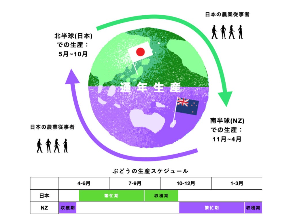 GREENCOLLARが自社事業の核である人材循環型の2拠点生産モデルを開放することで、日本の農業従事者のニュージーランドでのぶどうの生産が可能になるとともに、GREENCOLLARは生産人員を確保することで、ニュージーランドにおける事業展開を加速することが可能となります。
