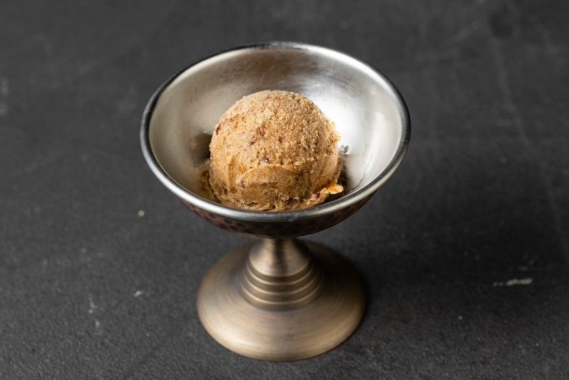 デーツ、いちじく、葡萄、プラムに、杏…古代メソポタミアには様々な果物が実りました。そのまま食べるのはもちろん、焼き菓子に用いたり、‘ムー’といわれる果実水にして味わっていました。デーツの果蜜と蒸留酒にじっくり漬けた味わい深い果実を使って、古代のムーをジェラートにしてみました。世界初の氷室があったメソポタミアですから、もしかすると王様はこんな氷菓も口にしていたかもしれません。