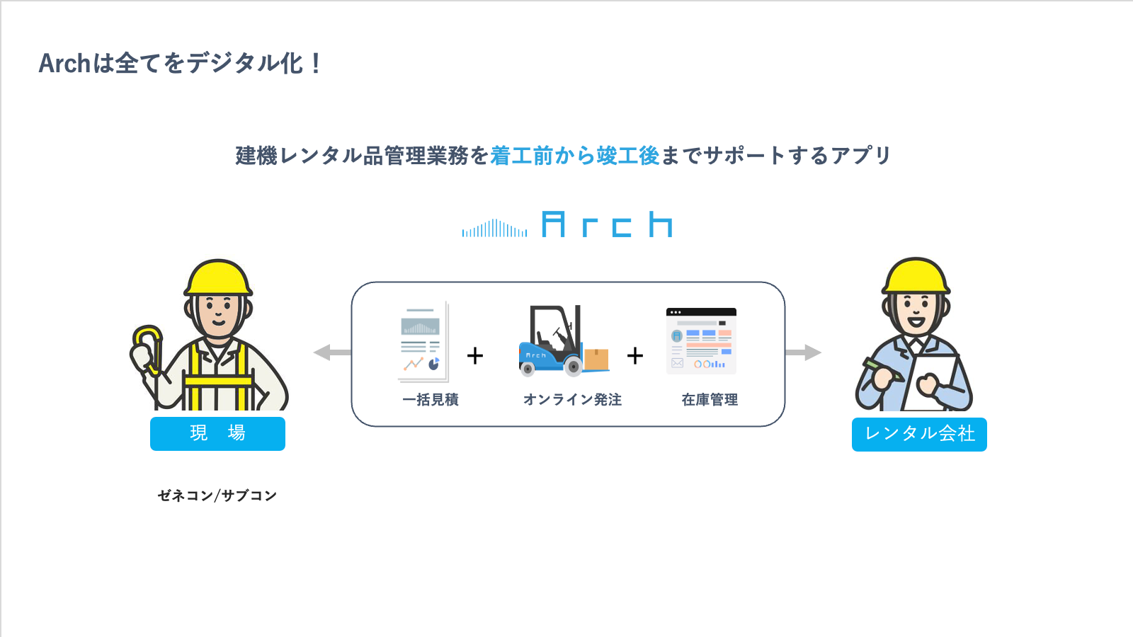 建機業界はアナログなプロセスが非常に多く残っており、建設現場での労働環境を改善するためにも、生産性向上が喫緊の課題であると認識しております。そのため、建設レンタル取引のDX化に目をつけ、見積から受発注、管理に至るまでを一気通貫でサポートする「Arch」というサービスには大きな可能性を感じております。
