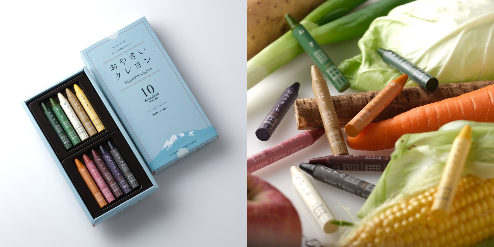 規格外などの理由ではじかれてしまう野菜や、収穫時に廃棄されてしまう外葉を原料にして着色。ベースとなるのは玄米を精米する際に発生する米ぬかから採れた米油とライスワックスです。発色を安定させるために配合される顔料も、食品の着色に使われるのと同じ成分。万が一口に入れても安全な天然由来成分でできています。食品ロス削減にもつながる、人にも環境にもやさしいクレヨンです。