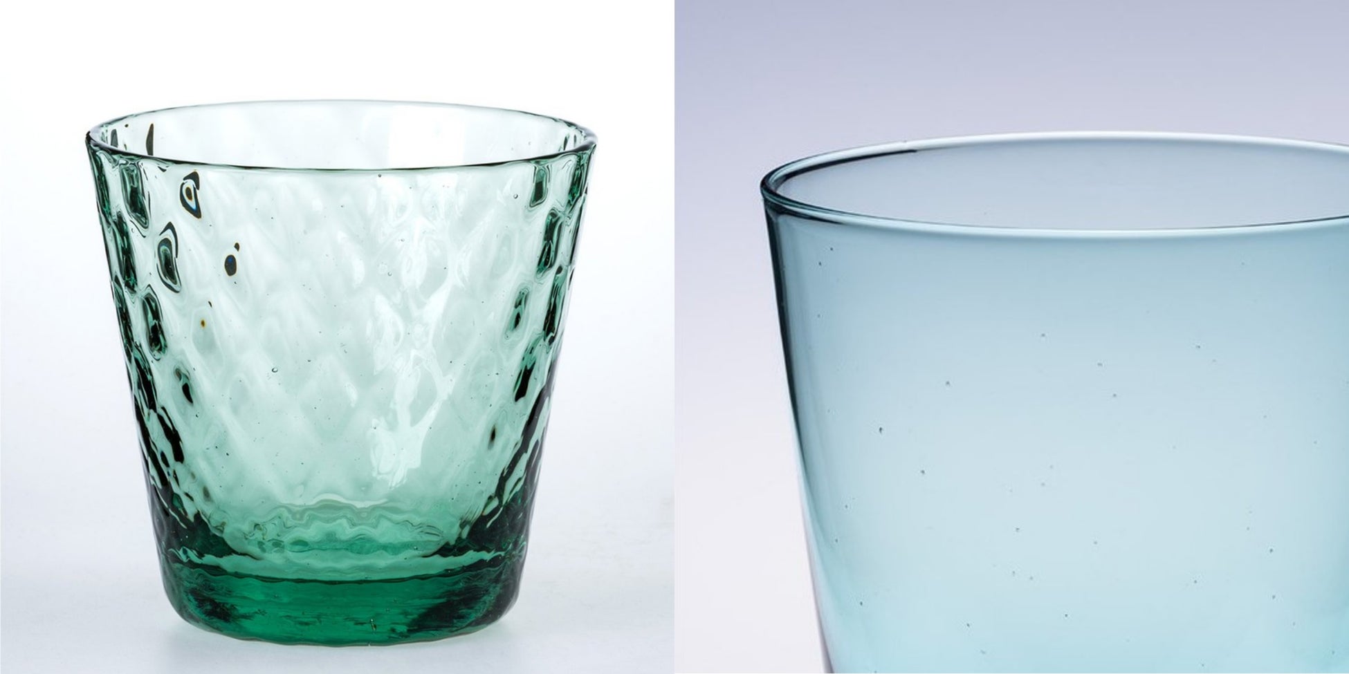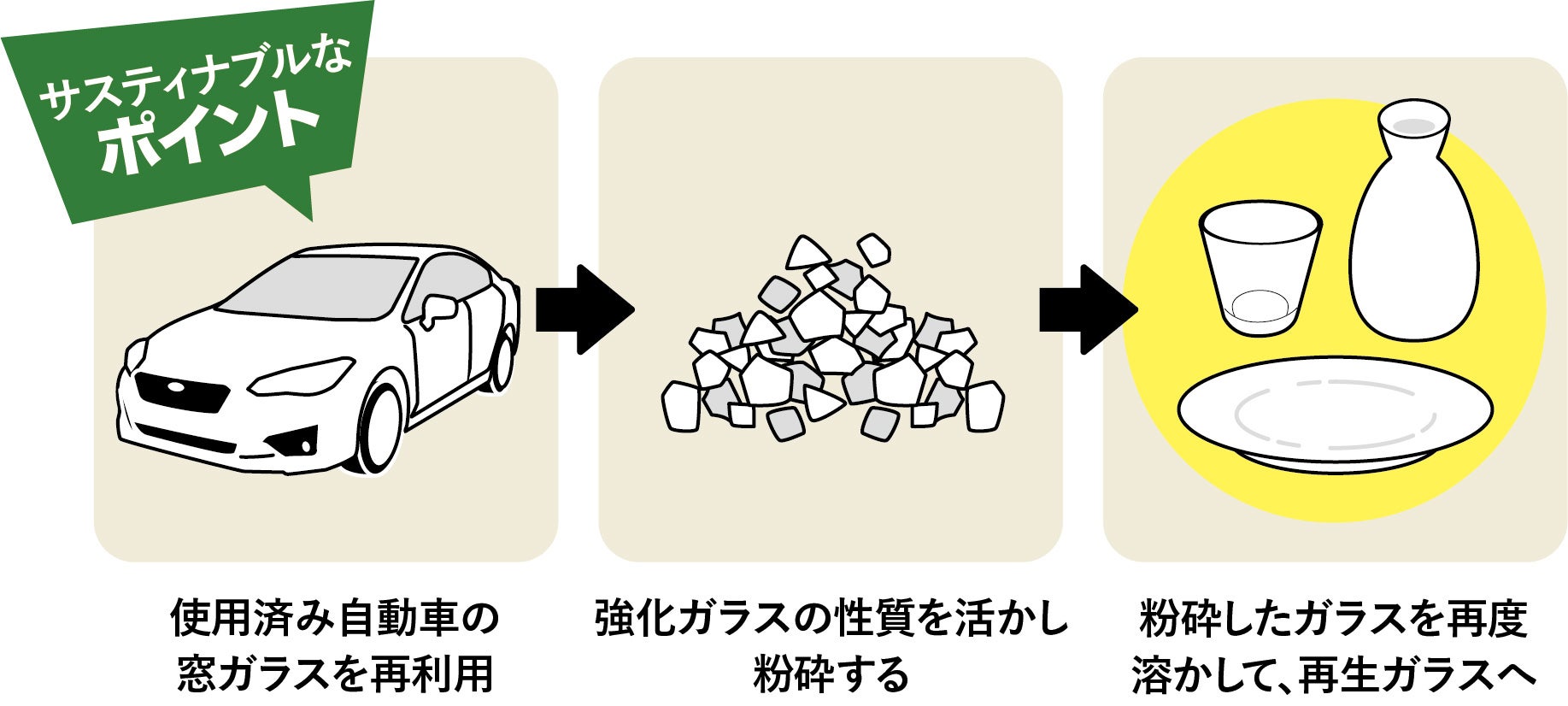 廃自動車の窓ガラスを破砕・収集しガラス職人の手によって再生ガラスとなります。窓ガラスに使われる強化ガラスは、一点集中の衝撃で細かく砕けるため、割れても鋭い破片にならずに細かいカレット状に。再粉砕する必要も少なく、扱いやすい素材です。不純物が混ざることで浮かぶ無数の気泡や独特な色合いは、アップサイクルならでは。1点1点違う自然が生むデザインが楽しめます。