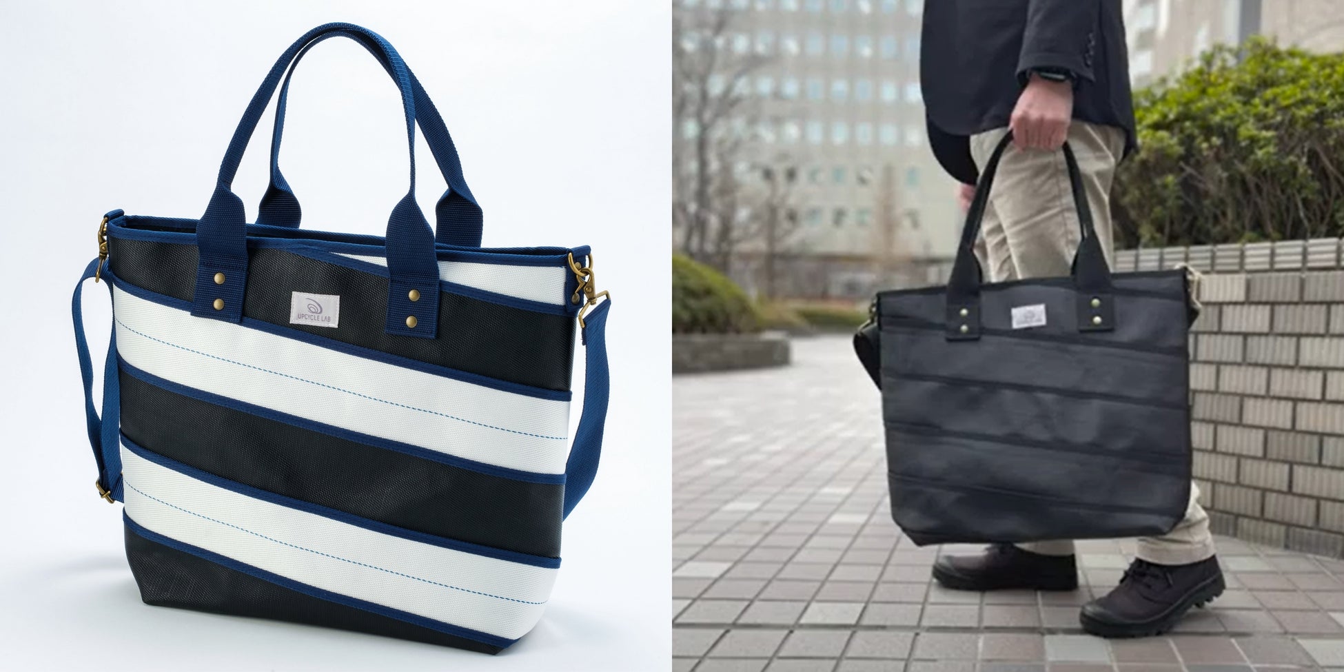 ビルや公共施設などに備え付けられた消防ホースの9割は新品のまま廃棄されてしまいます。回収したホースは洗浄、乾燥ののち、職人の手で丁寧に裁断、縫製されます。長いホースをらせん状に縫製することで、サイドに縦の縫い目が出ないのが特徴。もとの素材が持つ性能である耐久性と耐水性だけでなく、本来の形もデザインに活かされた作りになっています。