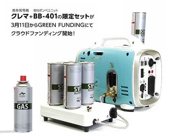 「クレマ」はカセットボンベ1本で運転が可能な発電機。プレヒート機能搭載で寒冷地でもすぐ始動でき、業界初のCOセンサー搭載で一酸化炭素濃度を監視・事故防止を行う賢い製品です。その「クレマ」に取り付けることで、運転時間を自由に選択できるようにする外付けユニット「BB-401」をセットにして、クラウドファンディングを行っています。クラウドファンディングページ:https://greenfunding.jp/lab/projects/5613