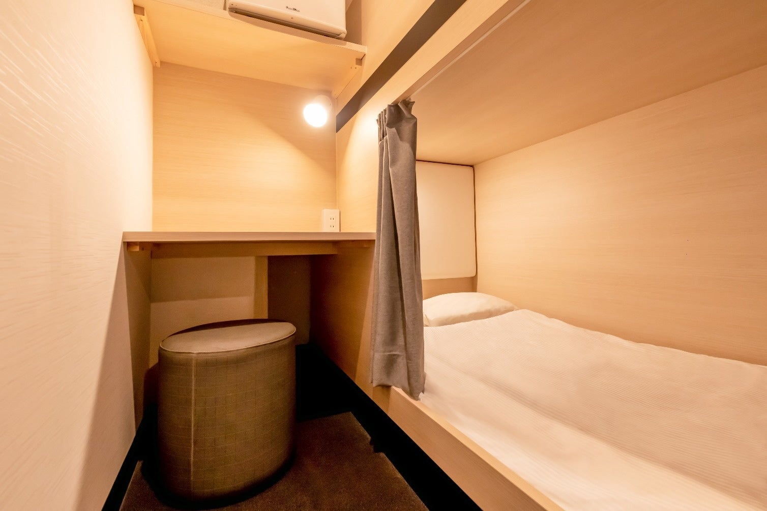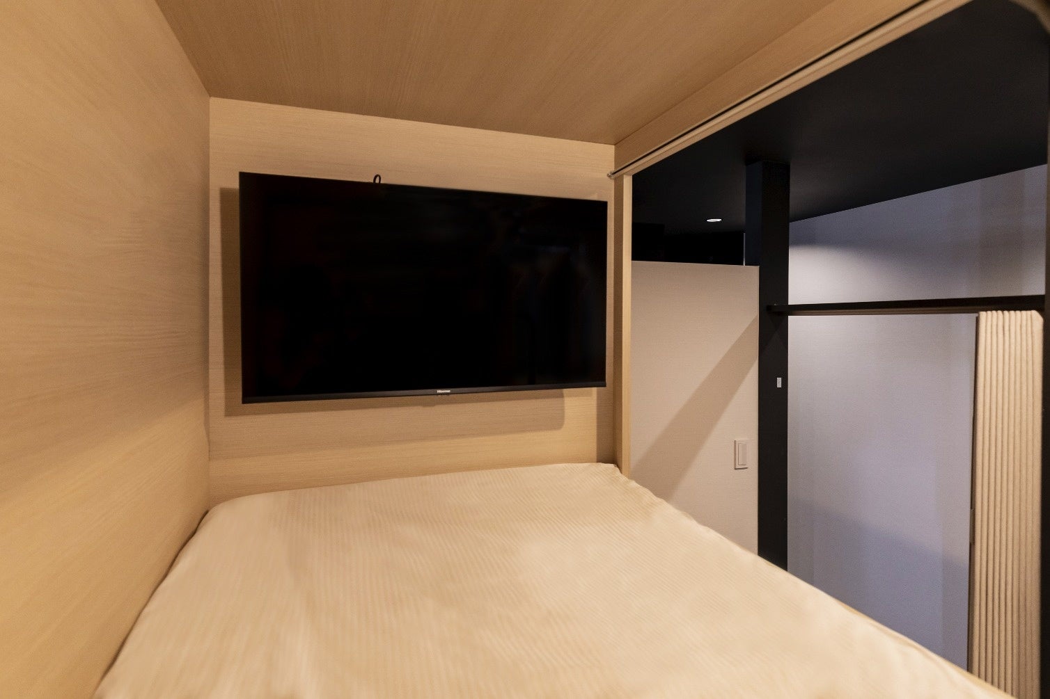 キャビンには全て大画面TV・冷蔵庫・テーブル・施錠式クローゼットが設備され、プライベートスペースを確保。男女ともに大浴場とサウナも備え、長期滞在・ビジネスワークも快適に。