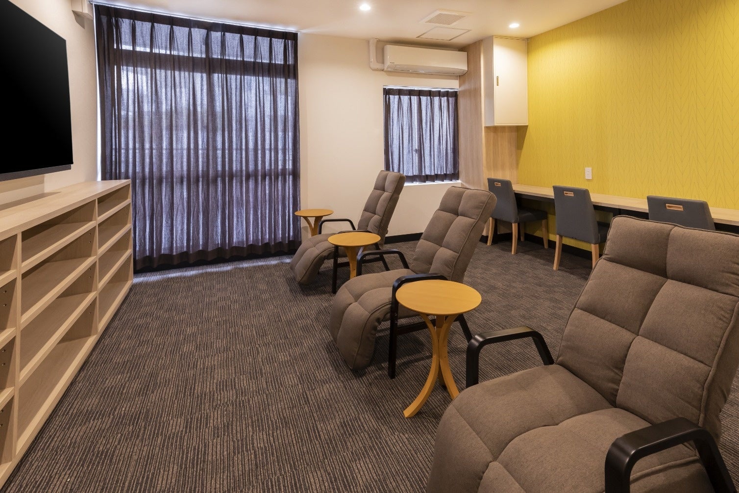 ・休憩スペースには65インチTV、マンガなどをご用意。ゆっくりとおくつろぎいただけまs。