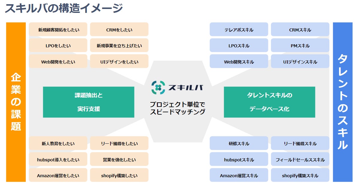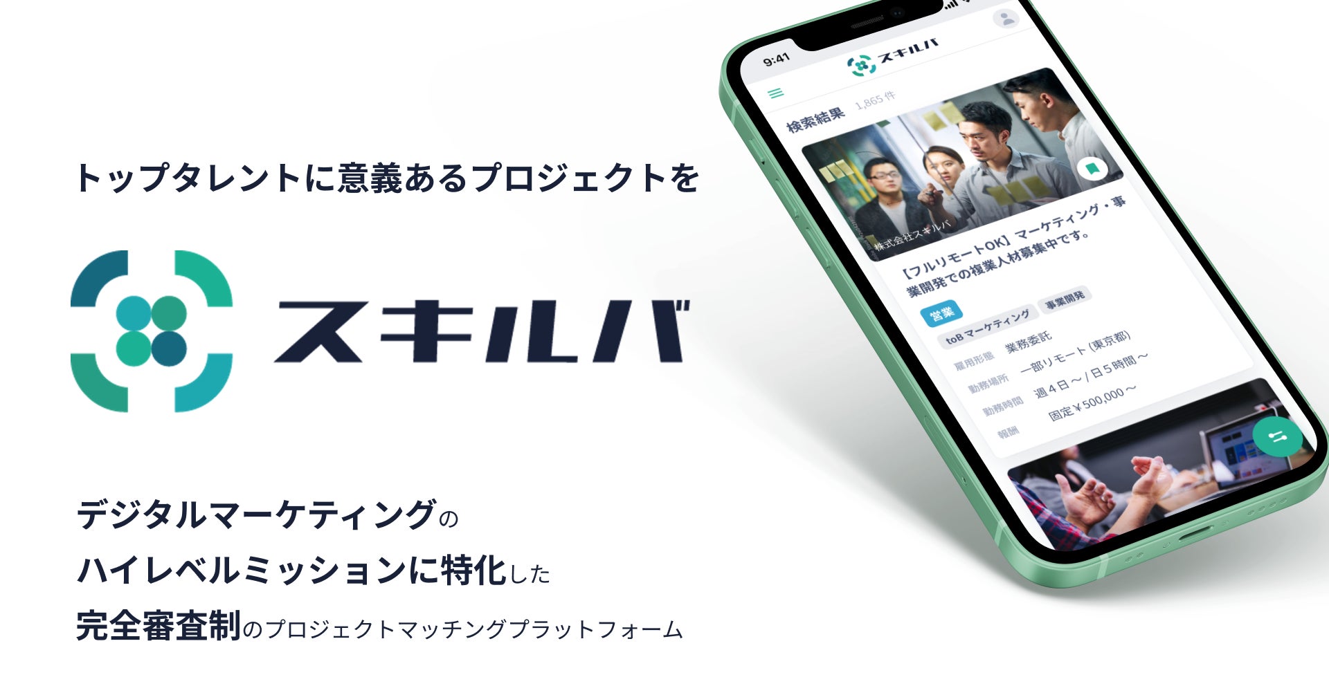 スキルバは、企業のデジタルマーケティングにおける課題と高度なスキルを持ったタレントをプロジェクト単位でマッチングするプラットフォームです。市場の変化やIT技術の進化、また昨今では新型コロナウイルスによる生活の変化にともない、企業のデジタルシフトは急激に加速しています。一方で、デジタル領域に長けた人材育成は追いついておらず企業にとって優秀な人材の確保は大きな課題といえます。スキルバは、プロジェクト単位でのマッチングとなるため、タレントは主にフリーランスや兼業・複業としてプロジェクトに参画いただくケースが多く、企業にとっては自社で獲得が困難な人材の採用やコストを抑えた人材登用が可能となります。また、タレントとして参画いただく個人の方にとっては、新しい知識やスキルの習得、時間を有効活用した副収入の獲得にもつなげることが可能です。