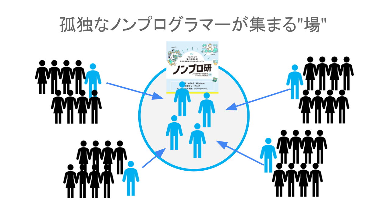 ノンプログラマーとは、プログラミングを本職としないビジネスパーソンのこと。ノンプロ研は有料月額制コミ ュニティとして、現在180人を超えるノンプログラマーが参加しております。わざわざお金を払ってまでプログラミング技術を学ぼうとしている学習意欲があるノンプログラマーがいるコミュニティは、心理的安全性の高い学習環境であるとともに、アウェイとして十分に機能します。