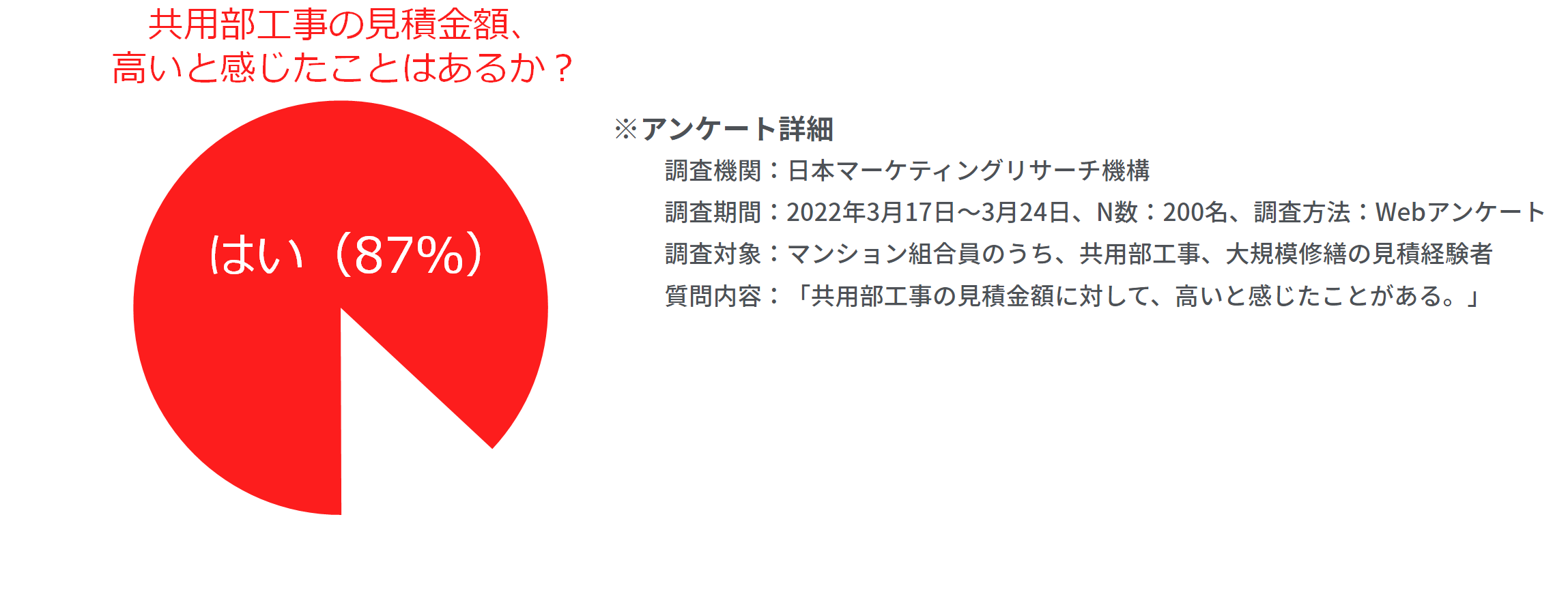 共用部工事、大規模修繕工事の見積経験者200名の方に対し「共用部工事の見積金額、高いと感じたことはあるか?」というアンケートを実施したところ、約9割が「はい」という回答でした。