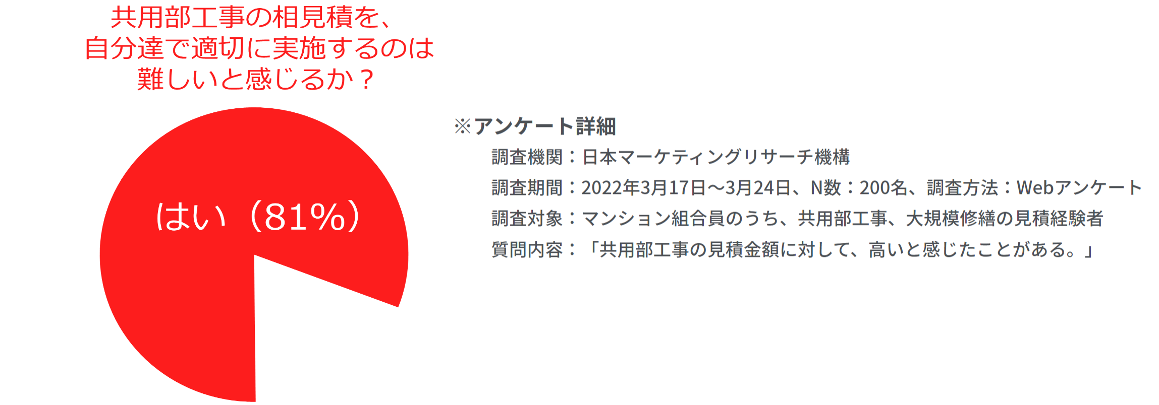 共用部工事、大規模修繕工事の見積経験者200名の方に対し「共用部工事の相見積を、自分達で適切に実施するのは難しいと感じるか?」というアンケートを実施したところ、約8割が「はい」という回答でした。