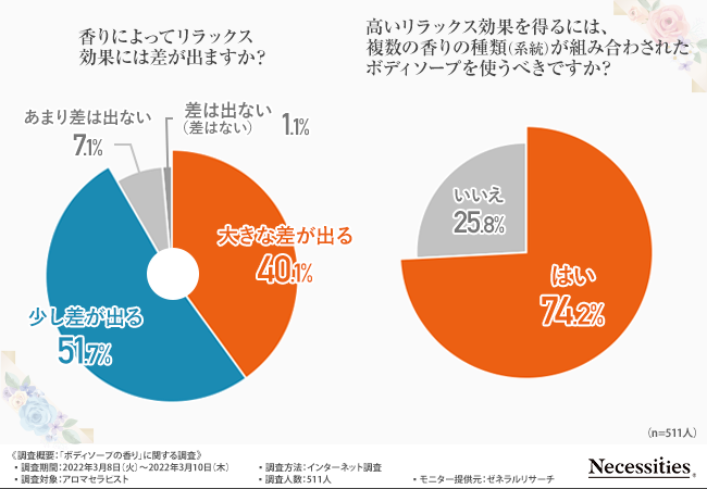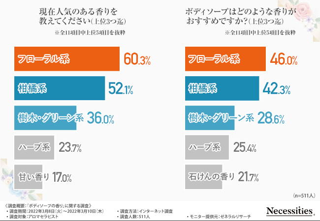 株式会社ネセシティーズジャパン(本社所在地:大阪府大阪市、代表取締役:鮫島 南々子)は、アロマセラピストを対象に、「ボディソープの香り」に関する調査を実施しました。