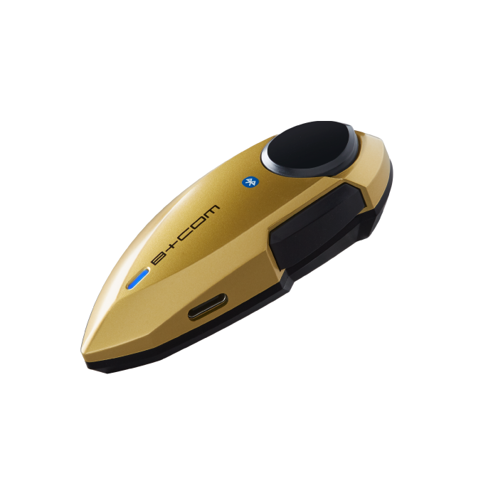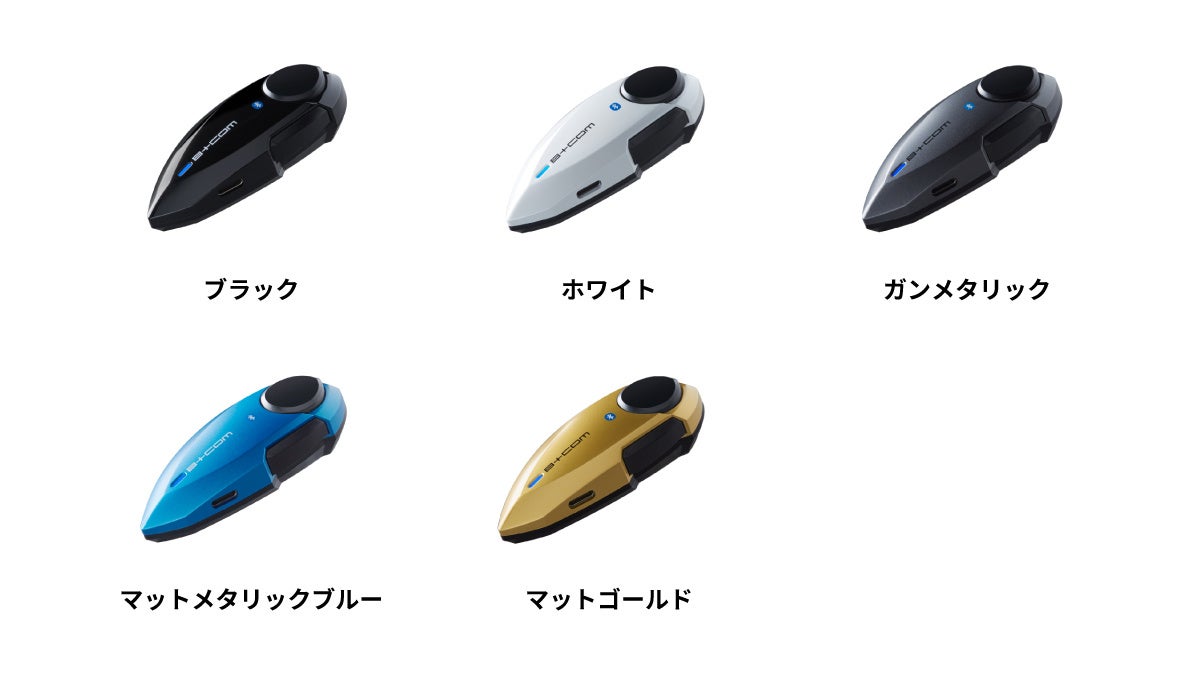 コンパクトでヘルメットになじみやすいデザインで、B+COM PLAY の個性を引き立たせる5 つのカラーバリエーションは、定番のブラック、ホワイトに加え、質感が特徴的で個性が際立つガンメタリック、マットゴールド、マットメタリックブルーをラインナップ。ヘルメットや愛車に合わせてお好きなカラーをお選びいただけます。
