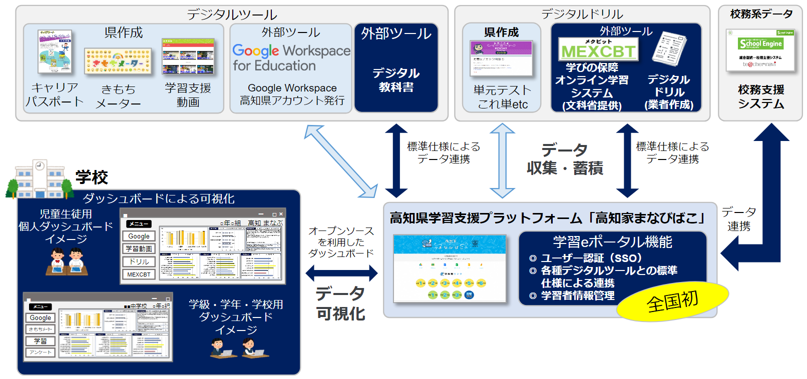 高知県は、文部科学省が開発しているCBTシステム「MEXCBT(メクビット)」や様々なデジタル教材などを連携させるハブである「学習eポータル」を独自に開発する、全国自治体初の取り組みを開始しました。これにより、スタディログを蓄積して児童生徒や教員に適切にフィードバックすることで、個別最適な学びの実現を目指します。