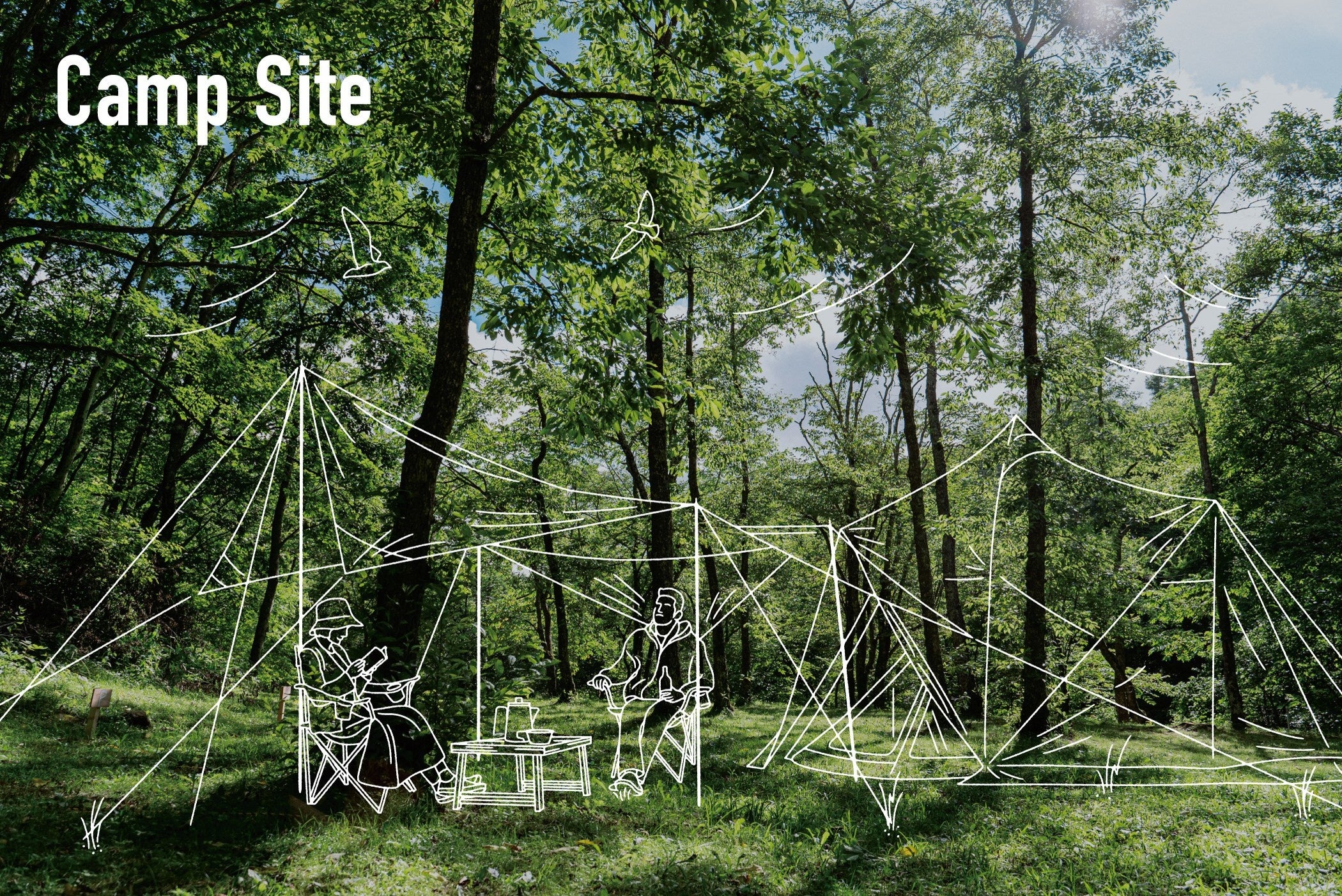 林と川に囲まれた場内中央に、飲食が可能なLoungeを建設予定です。自家焙煎のコーヒーや、山梨・長野で醸造されたクラフトビール、ナチュラルワイン、そのほか季節や土地に合わせた料理を提供します。
