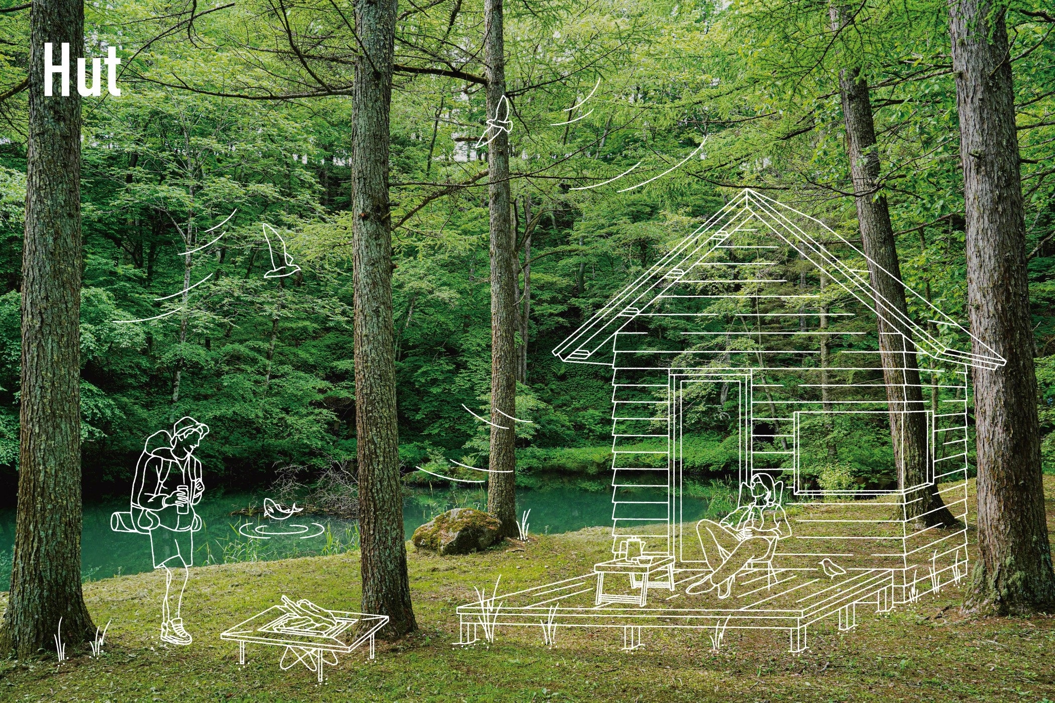 青々と茂った木々や小鳥がさえずる川辺など、美しい景色を切り取った窓をあけ、澄んだ空気を感じながらHutで迎える朝。青空のもとで家族や友人たちと食卓を囲み、デッキで本を読みながら、穏やかな時間を過ごす午後。場内中央のLoungeへと足を運び、レコードから流れる音楽とともに、ひと手間加えた料理とお酒を楽しむ夜。