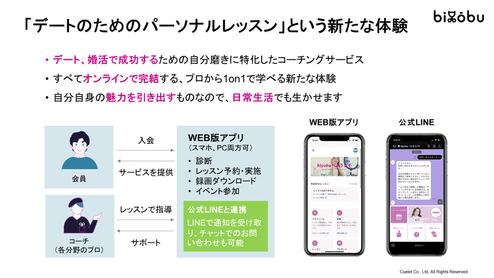 2021年の創業以来、biyobuはヘアメイクの学習に特化し、多くの利用者に愛されてきました。今回のリブランディングを通じて、サービスはより一層拡張され、結婚相談所の会員向けに特化したコンテンツを提供します。