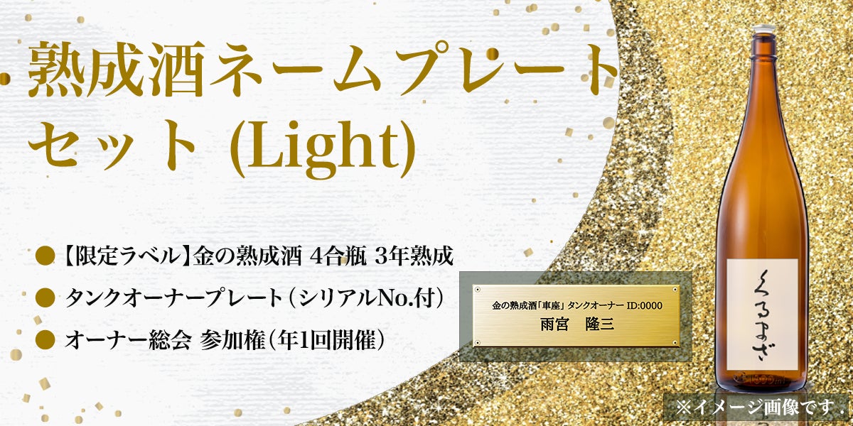 熟成酒タンクネームプレートと3年熟成酒「くるまざ」4合瓶(720ml)をお届け。オーナー総会参加権付き。