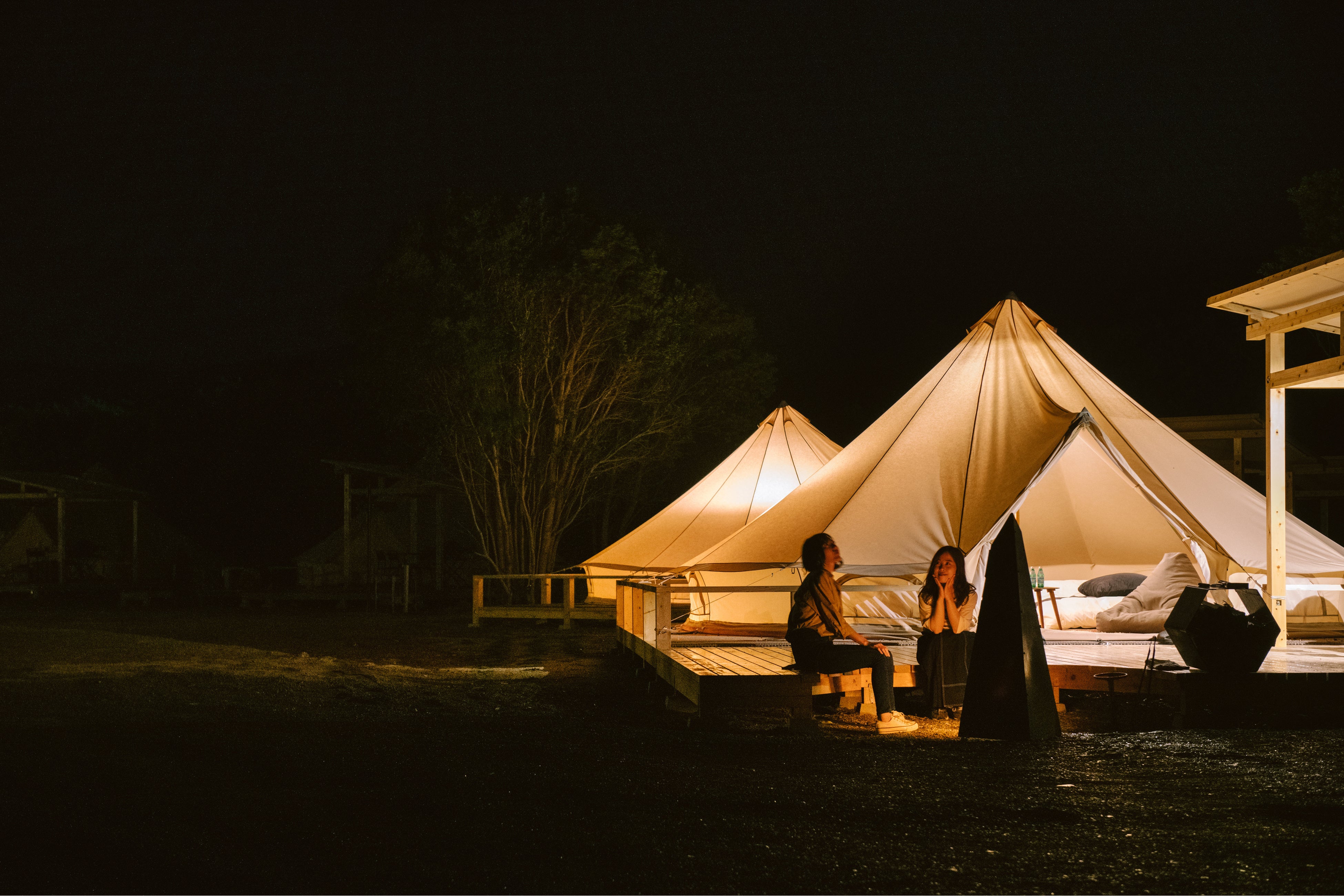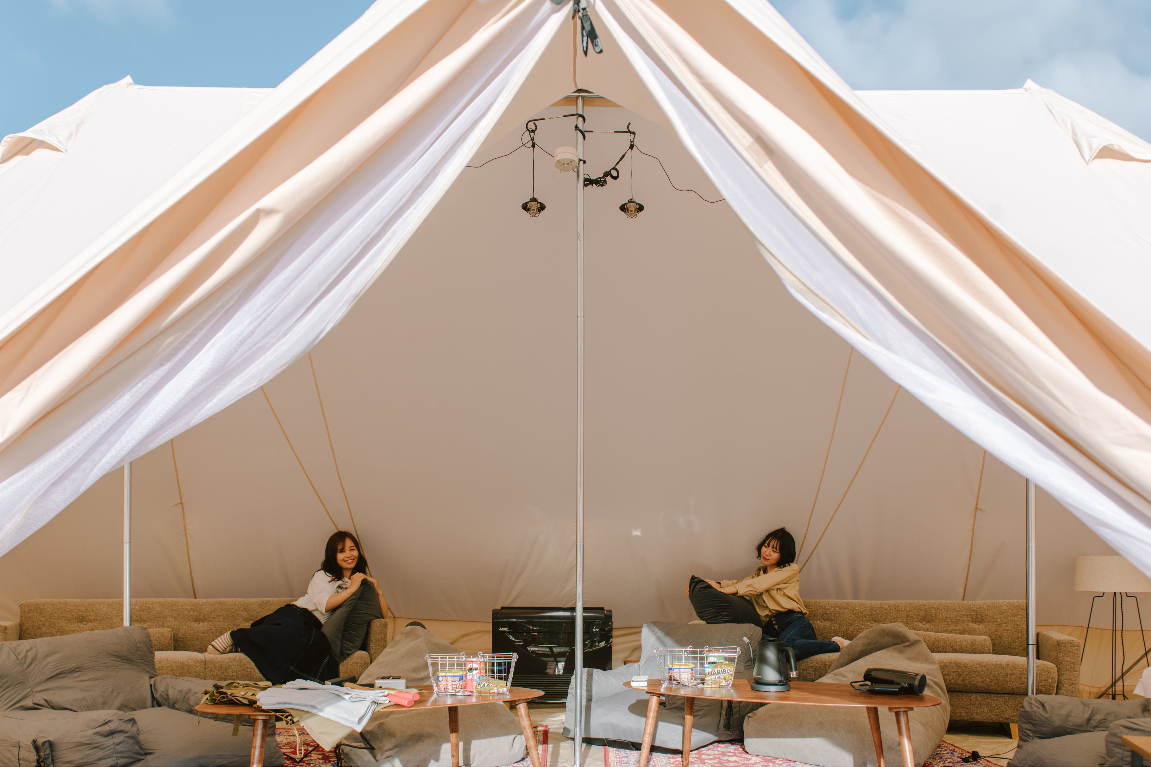 キャンプの気分をそのまま楽しめるグランピングテント。デザイナー監修の内装で、自然の中で快適かつ優雅に過ごす上質な宿泊体験をお楽しみください。家族やカップルでの旅行、ペット連れや大人数のグループ旅行でも、それぞれのニーズに合わせたお部屋をご用意しております。