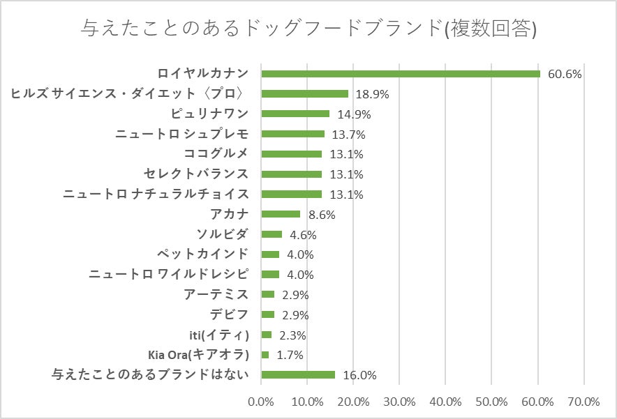 上記フードブランドのうち、愛犬に与えたことのあるものを複数選択していただきました。