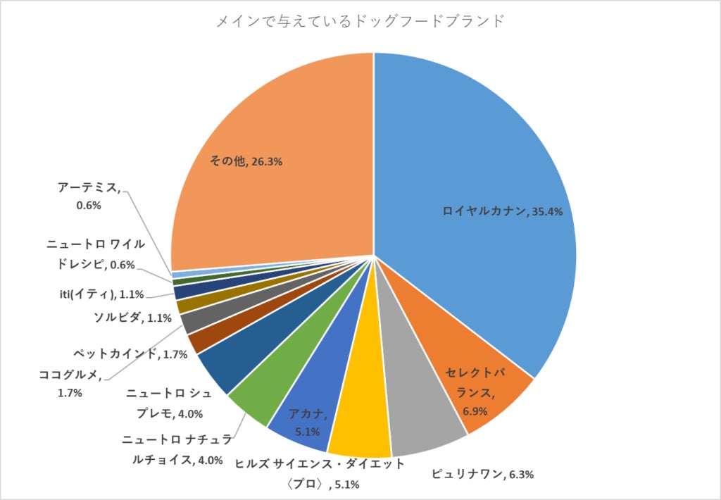 一方で、多様化の進展を感じさせる結果でもありました。今回は代表的なドッグフードブランドを選択肢に含めて調査を実施しましたが、26%の方が想定以外のフードをメインで利用していました。犬の好みやアレルギー、費用などに合わせて、多くの選択肢を試していることが窺えます。