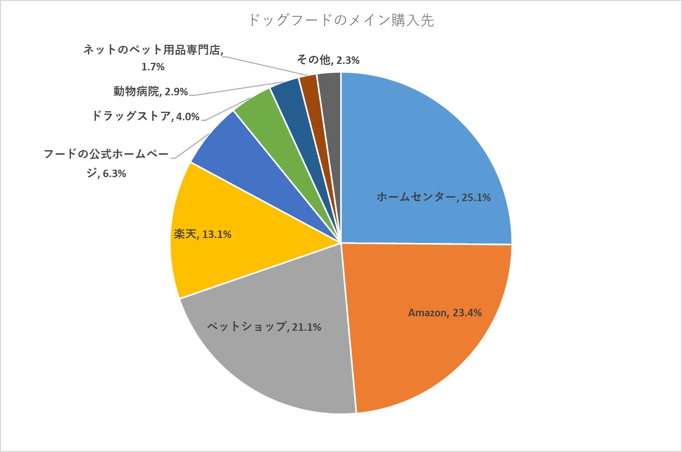 ドッグフードのメイン購入先として最も多い場所は「ホームセンター」。「Amazon」「ペットショップ」と続く