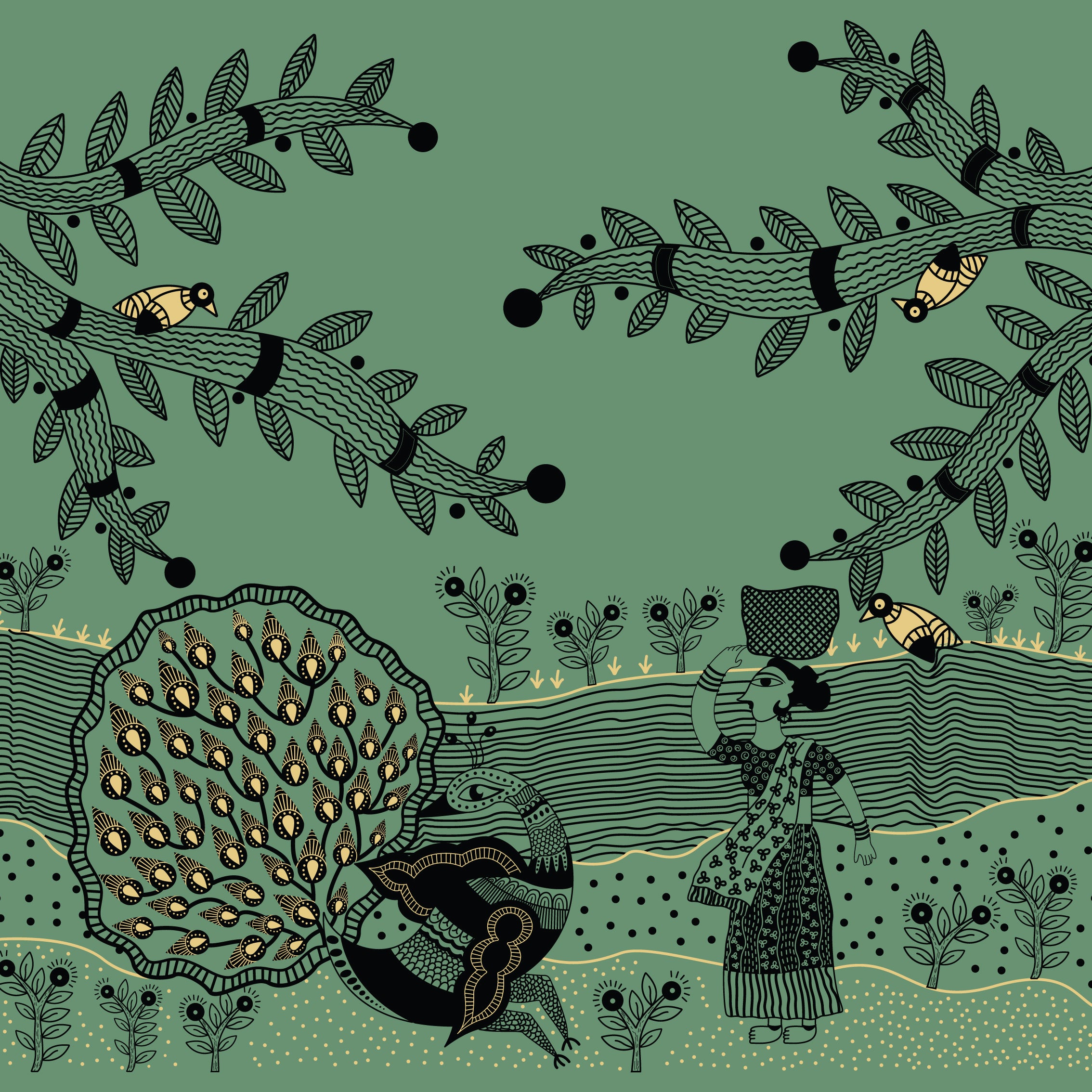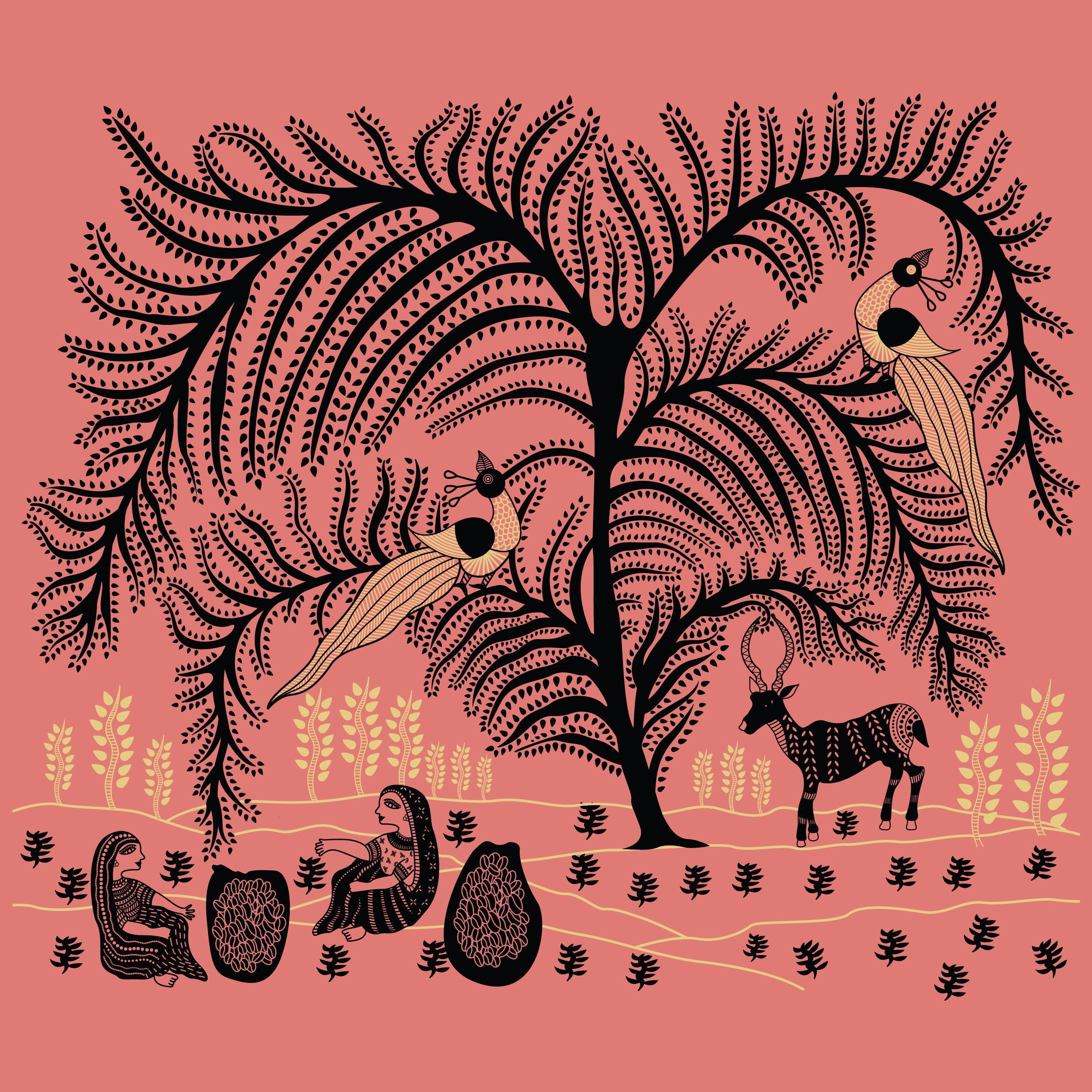 インドの伝統的な技法で描かれたアートを店内に展示。 左からマドゥバニ、ゴンド、マンダナ、マタニパチェディの各アートスタイル
