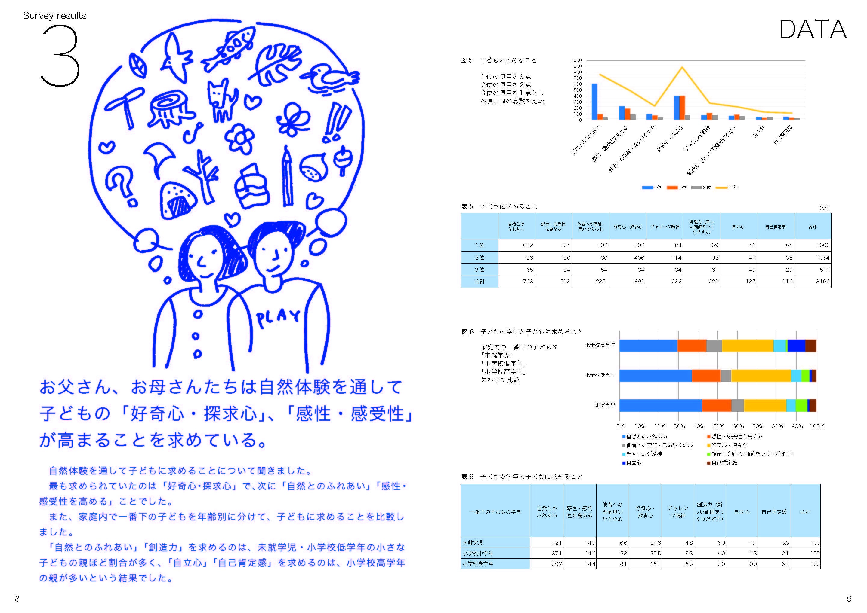 子どもに求めることについて、今回の調査では「好奇心・探求心」「感性・感受性」が最も求められています。しかし、2018年に森の学校が都心に居住する保護者410名に行った調査では「思いやりの心・他者への理解」が最も求められており、意識の違いがみられました。今後、新型コロナウイルスによる生活様式の変化により、親子の意識や行動も変化していくと考えられます。その変化についても引き続き注目していきたいと思います。