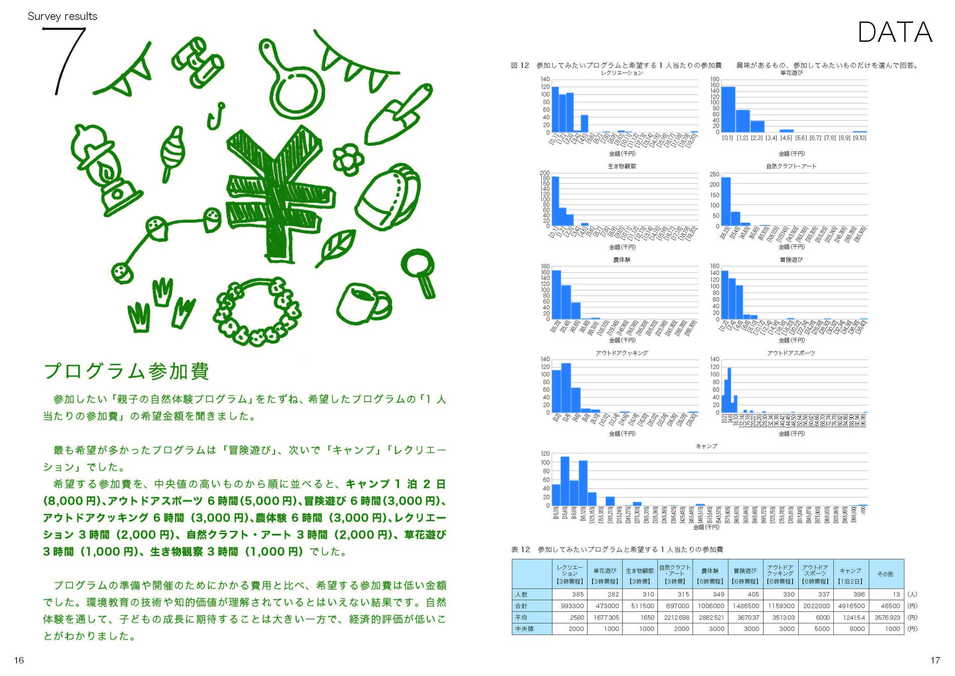 今後に関して、約92%の親が親子の自然体験を増やしたいと考え、自然体験を通して子どもの人間性が形成されることを期待する回答が多く、自然体験への希望の高さがわかりました。この状況下で、約49%の親が「自然の中での遊び方が分からない」「子どもとの遊び方が分からない」との困りごとを抱えていました。しかし、それらの要求に対して、環境教育プログラムの経済的評価が低い結果となっています。環境教育を推進するにあたって、その意義や価値を伝えることや、専門家の育成等への課題が浮き彫りになりました。