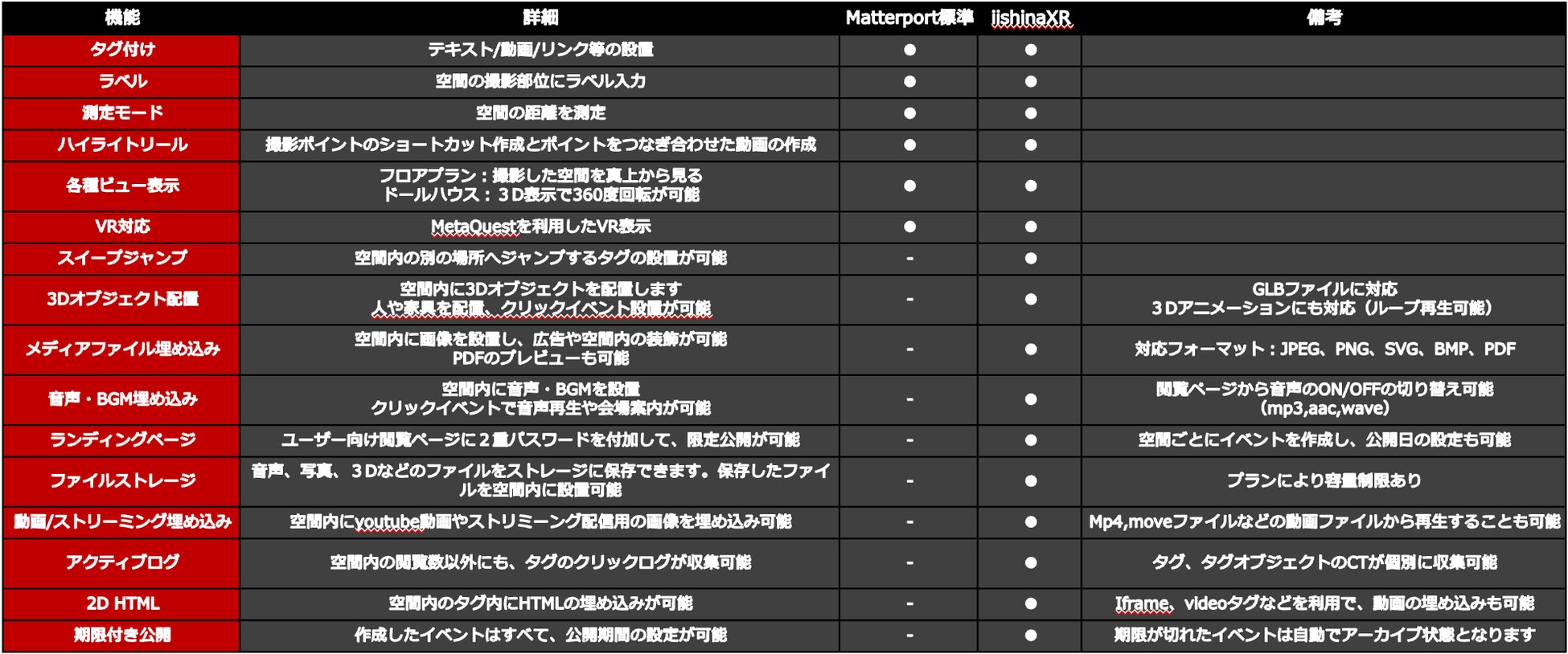 Matterportのサービスでは実際の建物(屋外・屋内)を3Dスキャナで撮影した4Kのハイクオリティ360°映像に加え、空間内をウォークスルーしたり空間内の対象物を説明するタグを設置したりできますが、「iishinaXR」では基本機能に加えて、3Dオブジェクト追加や音声・BGM、ライブ配信動画などを映像内に埋め込み「現実」と「CG」の映像を掛け合わせ『XR(クロスリアリティ)』を実現します。