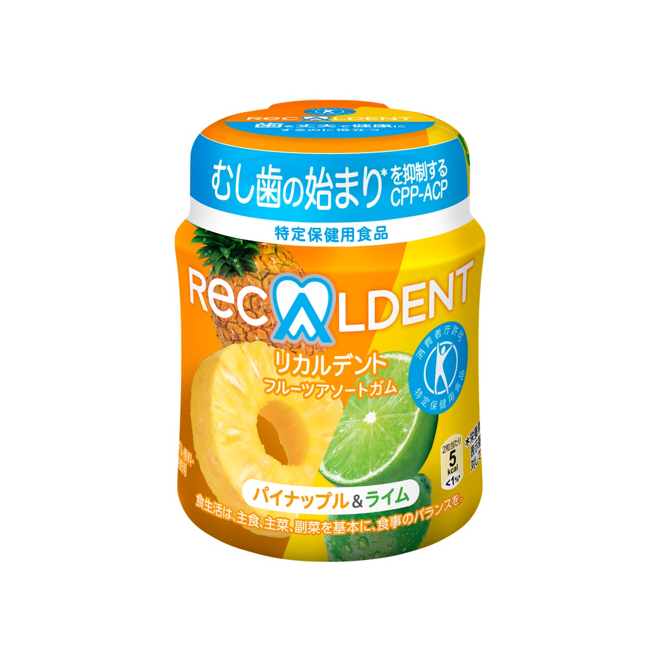 甘さと酸味のバランスが絶妙な「パイナップル」フレーバーと、さわやかでジューシーな味わいで人気を博した「ライムミント」フレーバーの2種の[NM3] 味をアソートボトルでご用意しました。一人のときも、家族といっしょのときも楽しめるフルーツの組み合わせで選ぶ楽しみをプラス。さらに、モンデリーズ・ジャパン独自開発のロングラスティング製法により味が長続きします。近年需要の高いアソートタイプガムの中でも、フルーツフレーバーで特定保健用食品は唯一※1です。『リカルデント フルーツアソートガム パイナップル&ライム』は、歯を大切にしながら、美味しさを楽しみたい、選べる楽しさを満喫したい方にぴったりです。